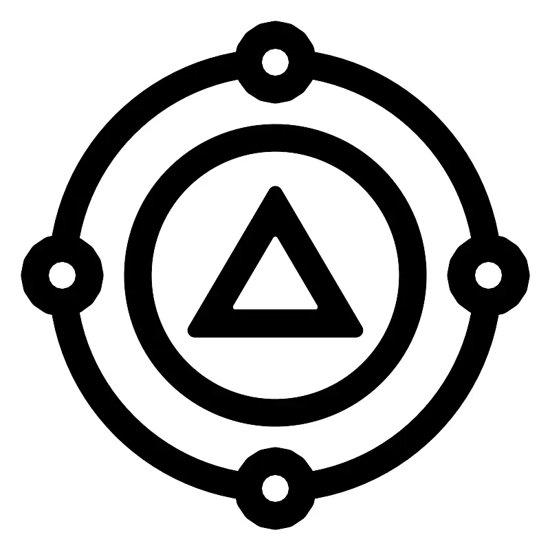 <svg width="800px" height="800px" viewBox="0 0 80 80" data-name="Layer 1" id="Layer_1" xmlns="http://www.w3.org/2000/svg"><defs><style>.cls-1{fill:none;stroke:#000000;stroke-linecap:round;stroke-linejoin:round;stroke-width:4px;}</style></defs><title/><path class="cls-1" d="M43.974,9.262C43.979,9.174,44,9.09,44,9a4,4,0,0,0-8,0c0,.09.021.174.026.262a3.981,3.981,0,0,0,7.947,0Z"/><path class="cls-1" d="M70.738,43.974c.088.006.172.026.262.026a4,4,0,0,0,0-8c-.09,0-.174.021-.262.026a3.981,3.981,0,0,0,0,7.947Z"/><path class="cls-1" d="M43.974,70.738c.006.088.026.172.026.262a4,4,0,0,1-8,0c0-.09.021-.174.026-.262a3.981,3.981,0,0,1,7.947,0Z"/><path class="cls-1" d="M9.262,43.974a3.981,3.981,0,0,0,0-7.947C9.174,36.021,9.09,36,9,36a4,4,0,0,0,0,8C9.09,44,9.174,43.979,9.262,43.974Z"/><path class="cls-1" d="M70.738,36.026A31,31,0,0,0,43.974,9.262"/><path class="cls-1" d="M70.738,43.974A31,31,0,0,1,43.974,70.738"/><path class="cls-1" d="M9.262,36.026A31,31,0,0,1,36.026,9.262"/><path class="cls-1" d="M36.026,70.738A31,31,0,0,1,9.262,43.974"/><circle class="cls-1" cx="40" cy="40" r="20"/><path d="M51.749,49h-23.5a1,1,0,0,1-.862-1.507L39.138,27.52a1,1,0,0,1,1.724,0L52.611,47.493A1,1,0,0,1,51.749,49ZM34.2,45H45.8a.4.4,0,0,0,.345-.6l-5.8-9.866a.4.4,0,0,0-.69,0l-5.8,9.866A.4.4,0,0,0,34.2,45Z"/></svg>