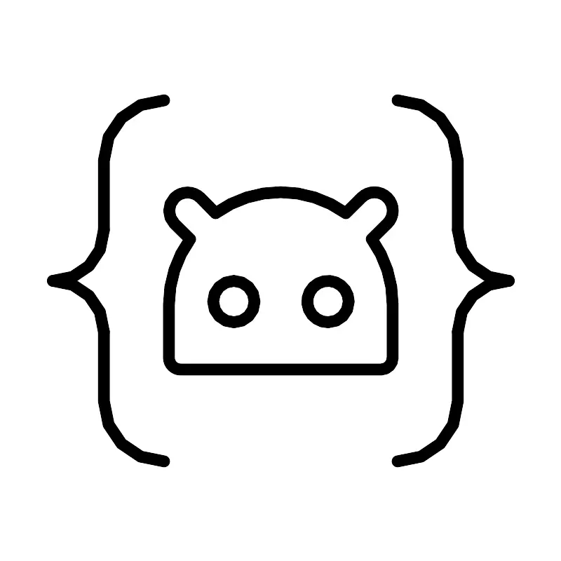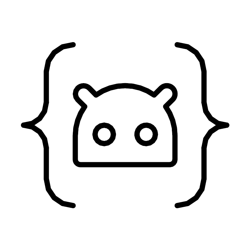 <svg width="800px" height="800px" viewBox="0 0 48 48" xmlns="http://www.w3.org/2000/svg"><defs><style>.a{fill:none;stroke:#000000;stroke-linecap:round;stroke-linejoin:round;}</style></defs><path class="a" d="M8.86,28.36v5.9358a5.148,5.148,0,0,0,5.148,5.148h0"/><path class="a" d="M14.0081,8.5561h0a5.148,5.148,0,0,0-5.148,5.148V19.64"/><path class="a" d="M8.86,19.64A4.36,4.36,0,0,1,4.5,24"/><path class="a" d="M4.5,24a4.36,4.36,0,0,1,4.36,4.36"/><path class="a" d="M39.14,19.64V13.7041a5.148,5.148,0,0,0-5.148-5.148h0"/><path class="a" d="M33.9919,39.4439h0a5.148,5.148,0,0,0,5.148-5.148V28.36"/><path class="a" d="M39.14,28.36A4.36,4.36,0,0,1,43.5,24"/><path class="a" d="M43.5,24a4.36,4.36,0,0,1-4.36-4.36"/><path class="a" d="M31.7749,20.4228l1.3414-1.3266a1.5625,1.5625,0,0,0,.0014-2.21l-.0014-.0014h0a1.5625,1.5625,0,0,0-2.21-.0112l-.0112.0112-1.3365,1.3267a9.532,9.532,0,0,0-11.1438,0l-1.2873-1.307a1.5722,1.5722,0,0,0-2.2236-.0022l-.0022.0022h0a1.5674,1.5674,0,0,0,0,2.2111l1.3364,1.3168a9.5517,9.5517,0,0,0-1.813,5.5817V30.579a1.0072,1.0072,0,0,0,1.0072,1.0073H32.5807a1.0072,1.0072,0,0,0,.9827-1.0073V26.0144A9.5371,9.5371,0,0,0,31.7749,20.4228Zm-11.7924,7.12a1.7689,1.7689,0,1,1,1.764-1.7738v.01a1.7639,1.7639,0,0,1-1.7639,1.7639h0Zm8.068,0a1.7689,1.7689,0,1,1,1.7541-1.7835v.02a1.7639,1.7639,0,0,1-1.7639,1.7639h.01Z"/></svg>
