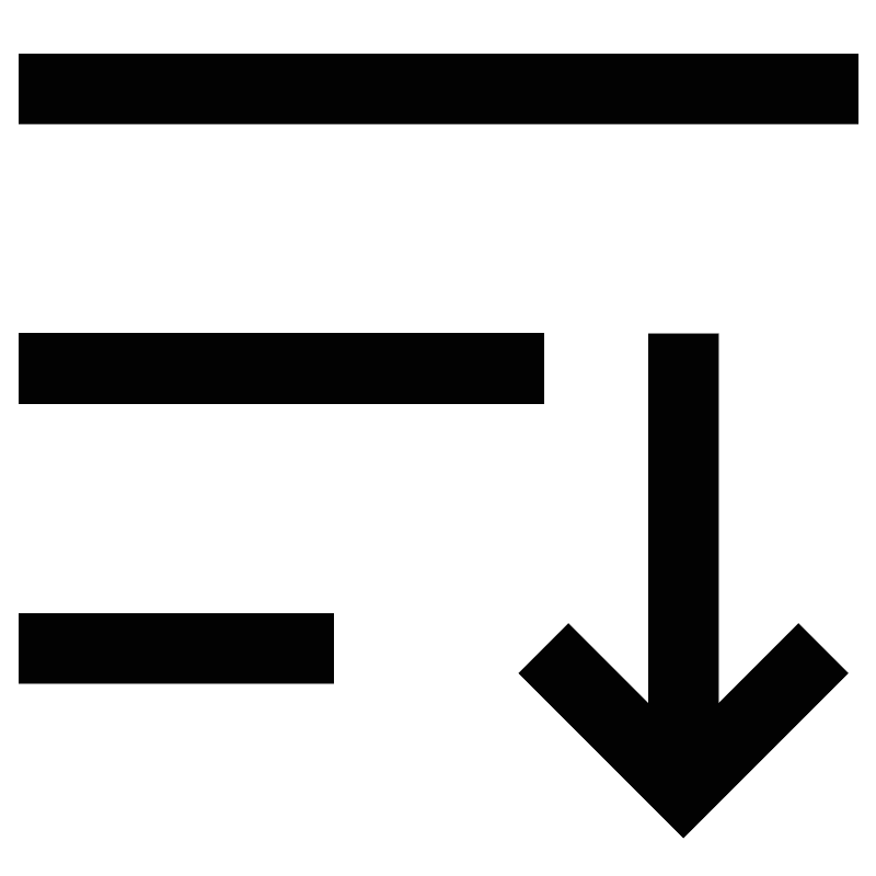 <svg width="800px" height="800px" viewBox="0 0 24 24" id="Layer_1" data-name="Layer 1" xmlns="http://www.w3.org/2000/svg"><defs><style>.cls-1{fill:none;stroke:#020202;stroke-miterlimit:10;stroke-width:1.92px;}</style></defs><line class="cls-1" x1="0.5" y1="2.42" x2="23.5" y2="2.42"/><line class="cls-1" x1="0.5" y1="10.08" x2="14.88" y2="10.08"/><line class="cls-1" x1="0.5" y1="17.75" x2="9.13" y2="17.75"/><line class="cls-1" x1="18.71" y1="9.13" x2="18.71" y2="20.63"/><polyline class="cls-1" points="22.54 17.75 18.71 21.58 14.88 17.75"/></svg>