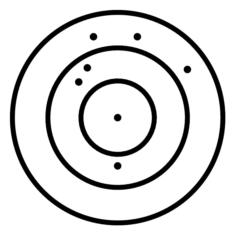 <svg width="800px" height="800px" viewBox="0 0 48 48" xmlns="http://www.w3.org/2000/svg"><defs><style>.a{fill:none;stroke:#000000;stroke-linecap:round;stroke-linejoin:round;}.b{fill:#000000;}</style></defs><circle class="a" cx="24" cy="24" r="21.5"/><circle class="a" cx="24" cy="24" r="7.5"/><circle class="a" cx="24" cy="24" r="14.25"/><circle class="b" cx="24" cy="33.8551" r="0.75"/><circle class="b" cx="24" cy="24" r="0.75"/><circle class="b" cx="16.0561" cy="16.7173" r="0.75"/><circle class="b" cx="17.8037" cy="13.8224" r="0.75"/><circle class="b" cx="19.0654" cy="7.472" r="0.75"/><circle class="b" cx="28.0234" cy="7.472" r="0.75"/><circle class="b" cx="38.25" cy="14.1589" r="0.75"/></svg>