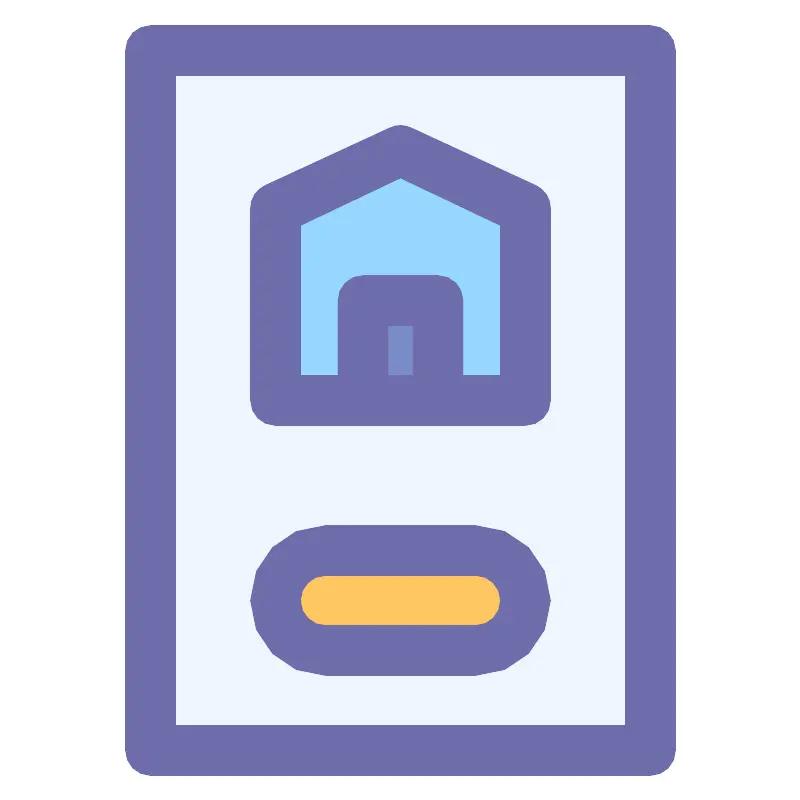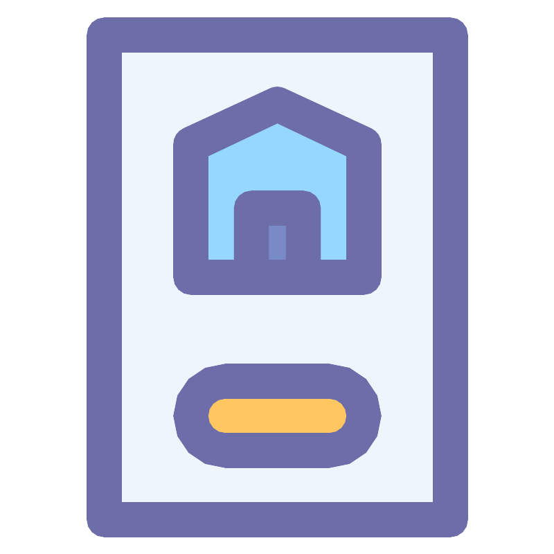 <svg width="800px" height="800px" viewBox="0 0 32 32" id="object" xmlns="http://www.w3.org/2000/svg"><defs><style>.cls-1{fill:#eef5fd;}.cls-2{fill:#6d6daa;}.cls-3{fill:#96d7ff;}.cls-4{fill:#798bc6;}.cls-5{fill:#ffc661;}</style></defs><title/><rect class="cls-1" height="28" width="20" x="6" y="2"/><path class="cls-2" d="M26,31H6a1,1,0,0,1-1-1V2A1,1,0,0,1,6,1H26a1,1,0,0,1,1,1V30A1,1,0,0,1,26,31ZM7,29H25V3H7Z"/><polygon class="cls-3" points="21 16 11 16 11 8.31 16 6 21 8.31 21 16"/><path class="cls-2" d="M21,17H11a1,1,0,0,1-1-1V8.31a1,1,0,0,1,.58-.91l5-2.31a1,1,0,0,1,.84,0l5,2.31a1,1,0,0,1,.58.91V16A1,1,0,0,1,21,17Zm-9-2h8V9L16,7.1,12,9Z"/><rect class="cls-4" height="4" width="3" x="14.5" y="12"/><path class="cls-2" d="M17.5,17h-3a1,1,0,0,1-1-1V12a1,1,0,0,1,1-1h3a1,1,0,0,1,1,1v4A1,1,0,0,1,17.5,17Zm-2-2h1V13h-1Z"/><rect class="cls-5" height="4" rx="2" ry="2" width="10" x="11" y="22"/><path class="cls-2" d="M19,27H13a3,3,0,0,1,0-6h6a3,3,0,0,1,0,6Zm-6-4a1,1,0,0,0,0,2h6a1,1,0,0,0,0-2Z"/></svg>