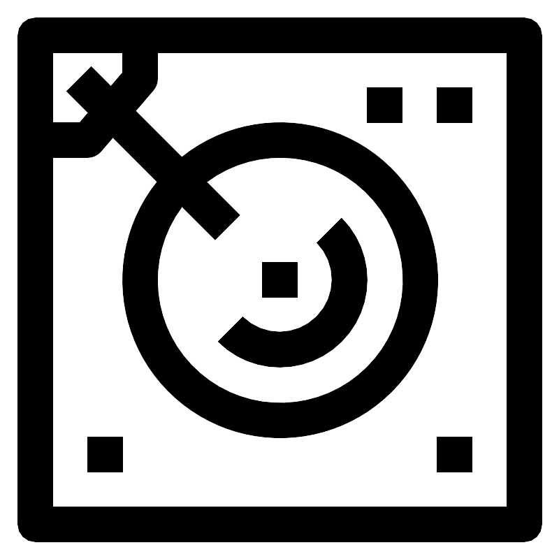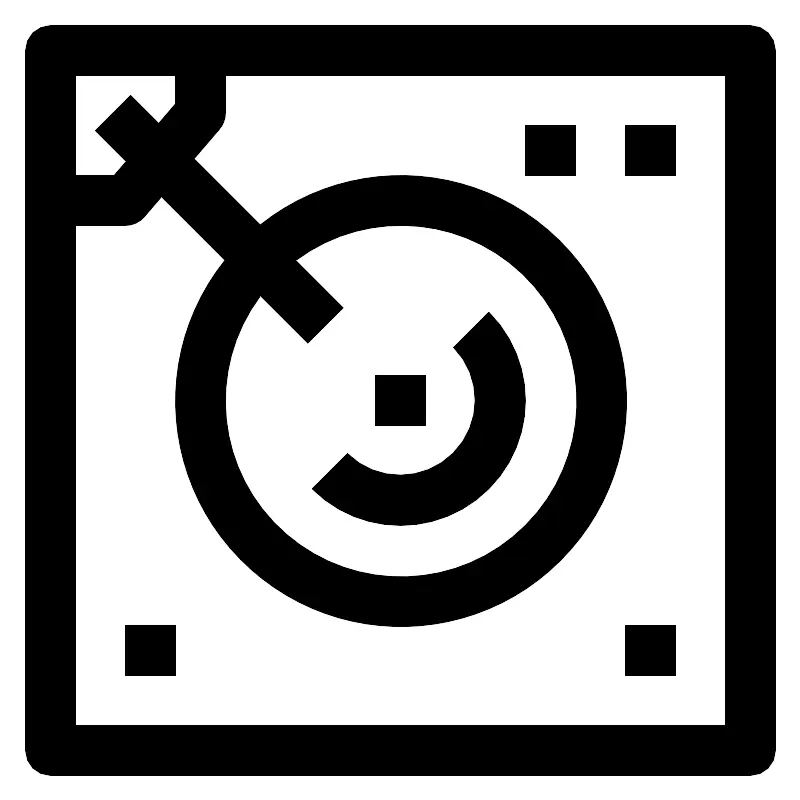 <svg fill="#000000" width="800px" height="800px" viewBox="0 0 64 64" data-name="Material Expand" id="Material_Expand" xmlns="http://www.w3.org/2000/svg"><path d="M60,2H4A2,2,0,0,0,2,4V60a2,2,0,0,0,2,2H60a2,2,0,0,0,2-2V4A2,2,0,0,0,60,2ZM14,6V8.26L12.656,9.828,10.414,7.586,7.586,10.414l2.46,2.46L9.08,14H6V6ZM58,58H6V18h4a2,2,0,0,0,1.519-.7l1.363-1.591,5.068,5.067a18.046,18.046,0,1,0,2.828-2.828l-5.285-5.285L17.519,10.3A2,2,0,0,0,18,9V6H58ZM24.586,27.414l2.828-2.828L23.631,20.8A14.053,14.053,0,1,1,20.8,23.631Z"/><rect height="4" width="4" x="30" y="30"/><rect height="4" width="4" x="50" y="10"/><rect height="4" width="4" x="50" y="50"/><rect height="4" width="4" x="10" y="50"/><rect height="4" width="4" x="42" y="10"/><path d="M39.071,39.071a10,10,0,0,0,0-14.142l-2.828,2.829a6,6,0,0,1-8.485,8.485l-2.829,2.828a10,10,0,0,0,14.142,0Z"/></svg>