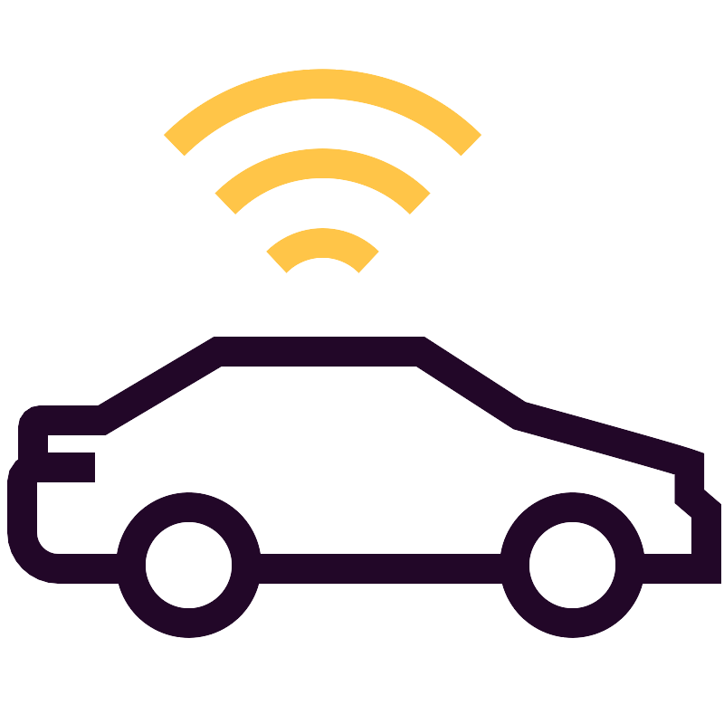<svg width="800px" height="800px" viewBox="0 0 200 200" xmlns="http://www.w3.org/2000/svg"><title>Virtual Reality icons</title><circle cx="52" cy="156" r="16" fill="none" stroke="#220728" stroke-miterlimit="10" stroke-width="8"/><circle cx="158" cy="156" r="16" fill="none" stroke="#220728" stroke-miterlimit="10" stroke-width="8"/><path d="M34,157H16A10,10,0,0,1,6,147V133a4,4,0,0,1,4-4H26" fill="none" stroke="#220728" stroke-miterlimit="10" stroke-width="8"/><line x1="144" y1="157" x2="64" y2="157" fill="none" stroke="#220728" stroke-miterlimit="10" stroke-width="8"/><path d="M171,157h24V141l-4.67-4v-9c-5.68-2-47-13.33-47-13.33L116,97H60L28,116H11a2,2,0,0,0-2,2v13" fill="none" stroke="#220728" stroke-miterlimit="10" stroke-width="8"/><path d="M62.13,56.13a38,38,0,0,1,53.74,0" fill="none" stroke="#ffc548" stroke-miterlimit="10" stroke-width="8"/><path d="M48,40a58,58,0,0,1,82,0" fill="none" stroke="#ffc548" stroke-miterlimit="10" stroke-width="8"/><path d="M76.27,72.27a18,18,0,0,1,25.46,0" fill="none" stroke="#ffc548" stroke-miterlimit="10" stroke-width="8"/></svg>