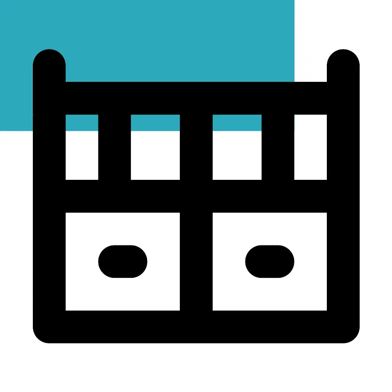 <svg fill="#000000" width="800px" height="800px" viewBox="0 0 24 24" id="baby-crib-2" data-name="Flat Line" xmlns="http://www.w3.org/2000/svg" class="icon flat-line"><rect id="secondary" x="3" y="12" width="18" height="8" transform="translate(24 32) rotate(180)" style="fill: rgb(44, 169, 188); stroke-width: 2;"></rect><path id="primary" d="M7,16H8m8,0h1M12,6v6m5-6v6M7,12V6M3,20H21V12H3Zm0,0h9V12H3Zm18-8V6H3v6Zm0-6V4M3,6V4" style="fill: none; stroke: rgb(0, 0, 0); stroke-linecap: round; stroke-linejoin: round; stroke-width: 2;"></path></svg>