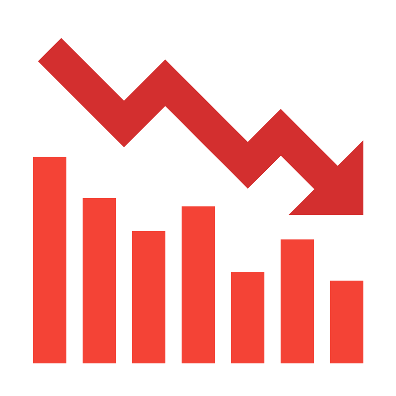 <svg width="800px" height="800px" viewBox="0 0 1024 1024" class="icon" version="1.1" xmlns="http://www.w3.org/2000/svg"><path d="M853.333333 725.333333h85.333334v213.333334h-85.333334zM725.333333 618.666667h85.333334v320h-85.333334zM597.333333 704h85.333334v234.666667h-85.333334zM469.333333 533.333333h85.333334v405.333334h-85.333334zM341.333333 597.333333h85.333334v341.333334h-85.333334zM213.333333 512h85.333334v426.666667h-85.333334zM85.333333 405.333333h85.333334v533.333334H85.333333z" fill="#F44336" /><path d="M725.333333 281.6l-85.333333 85.333333-213.333333-213.333333-106.666667 106.666667-162.133333-162.133334-59.733334 59.733334L320 379.733333l106.666667-106.666666 213.333333 213.333333 85.333333-85.333333 130.133334 130.133333 59.733333-59.733333z" fill="#D32F2F" /><path d="M938.666667 554.666667h-192l192-192z" fill="#D32F2F" /></svg>