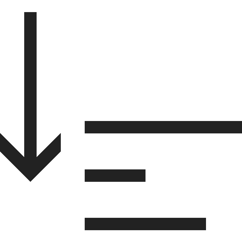<path d="M 2 1 L 2 13 L 0 11 L 0 12.5 L 2.5 15 L 5 12.5 L 5 11 L 3 13 L 3 1 L 2 1 z M 7 10 L 7 11 L 20 11 L 20 10 L 7 10 z M 7 14 L 7 15 L 12 15 L 12 14 L 7 14 z M 7 18 L 7 19 L 17 19 L 17 18 L 7 18 z " style="fill:#222222; fill-opacity:1; stroke:none; stroke-width:0px;"/>