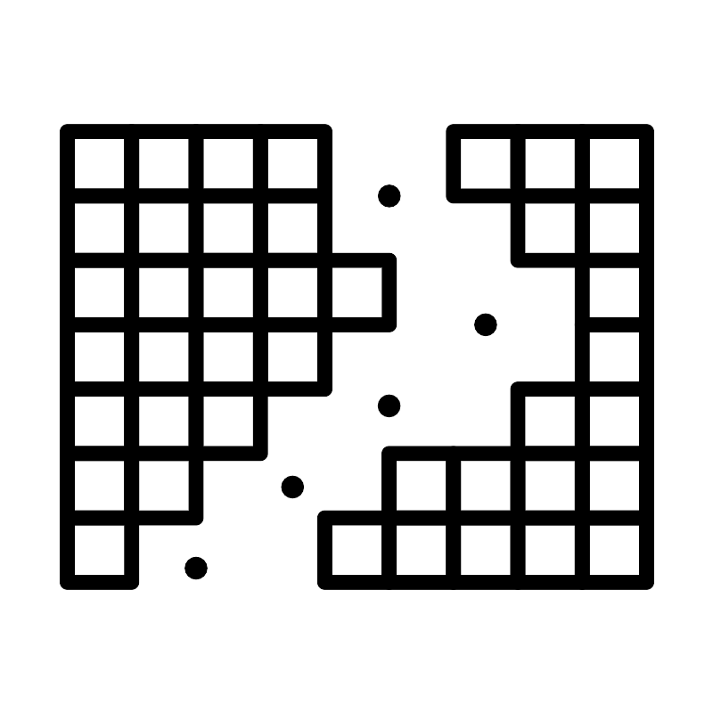 <svg width="800px" height="800px" viewBox="0 0 48 48" xmlns="http://www.w3.org/2000/svg"><defs><style>.a{fill:none;stroke:#000000;stroke-linecap:round;stroke-linejoin:round;}.b{fill:#000000;}</style></defs><rect class="a" x="39.1657" y="8.8299" width="4.3343" height="4.3343"/><rect class="a" x="39.1657" y="13.1642" width="4.3343" height="4.3343"/><rect class="a" x="39.1657" y="17.4985" width="4.3343" height="4.3343"/><rect class="a" x="39.1657" y="21.8328" width="4.3343" height="4.3343"/><rect class="a" x="39.1657" y="26.1672" width="4.3343" height="4.3343"/><rect class="a" x="39.1657" y="30.5015" width="4.3343" height="4.3343"/><rect class="a" x="39.1657" y="34.8358" width="4.3343" height="4.3343"/><rect class="a" x="4.5" y="8.8299" width="4.3343" height="4.3343"/><rect class="a" x="4.5" y="13.1642" width="4.3343" height="4.3343"/><rect class="a" x="4.5" y="17.4985" width="4.3343" height="4.3343"/><rect class="a" x="4.5" y="21.8328" width="4.3343" height="4.3343"/><rect class="a" x="4.5" y="26.1672" width="4.3343" height="4.3343"/><rect class="a" x="4.5" y="30.5015" width="4.3343" height="4.3343"/><rect class="a" x="8.8343" y="8.8299" width="4.3343" height="4.3343"/><rect class="a" x="8.8343" y="13.1642" width="4.3343" height="4.3343"/><rect class="a" x="8.8343" y="17.4985" width="4.3343" height="4.3343"/><rect class="a" x="8.8343" y="21.8328" width="4.3343" height="4.3343"/><rect class="a" x="8.8343" y="26.1672" width="4.3343" height="4.3343"/><rect class="a" x="13.1686" y="8.8299" width="4.3343" height="4.3343"/><rect class="a" x="13.1686" y="13.1642" width="4.3343" height="4.3343"/><rect class="a" x="13.1686" y="17.4985" width="4.3343" height="4.3343"/><rect class="a" x="13.1686" y="21.8328" width="4.3343" height="4.3343"/><rect class="a" x="17.5085" y="8.8299" width="4.3343" height="4.3343"/><rect class="a" x="17.5085" y="13.1642" width="4.3343" height="4.3343"/><rect class="a" x="17.5085" y="17.4985" width="4.3343" height="4.3343"/><rect class="a" x="21.8428" y="17.4985" width="4.3343" height="4.3343"/><rect class="a" x="17.5085" y="21.8328" width="4.3343" height="4.3343"/><rect class="a" x="13.1686" y="26.1672" width="4.3343" height="4.3343"/><rect class="a" x="8.8343" y="30.5015" width="4.3343" height="4.3343"/><rect class="a" x="4.5" y="34.8358" width="4.3343" height="4.3343"/><rect class="a" x="34.8314" y="8.8299" width="4.3343" height="4.3343"/><rect class="a" x="34.8314" y="13.1642" width="4.3343" height="4.3343"/><rect class="a" x="34.8314" y="26.1672" width="4.3343" height="4.3343"/><rect class="a" x="34.8314" y="30.5015" width="4.3343" height="4.3343"/><rect class="a" x="34.8314" y="34.8358" width="4.3343" height="4.3343"/><rect class="a" x="30.497" y="8.8299" width="4.3343" height="4.3343"/><rect class="a" x="30.497" y="30.5015" width="4.3343" height="4.3343"/><rect class="a" x="30.497" y="34.8358" width="4.3343" height="4.3343"/><rect class="a" x="26.1627" y="30.5015" width="4.3343" height="4.3343"/><rect class="a" x="26.1627" y="34.8358" width="4.3343" height="4.3343"/><rect class="a" x="21.8328" y="34.8358" width="4.3343" height="4.3343"/><circle class="b" cx="32.6642" cy="21.8328" r="0.75"/><circle class="b" cx="26.1771" cy="13.1642" r="0.75"/><circle class="b" cx="26.1657" cy="27.2952" r="0.75"/><circle class="b" cx="19.6672" cy="32.7576" r="0.75"/><circle class="b" cx="13.1686" cy="38.22" r="0.75"/></svg>