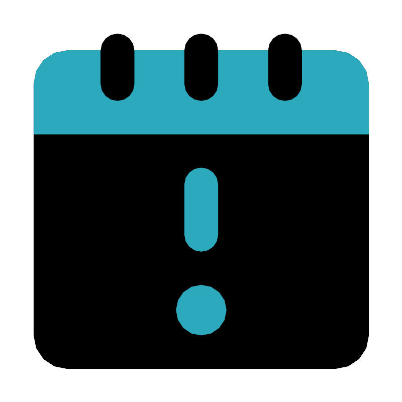 <svg fill="#000000" width="800px" height="800px" viewBox="0 0 24 24" id="calendar-alert-2" data-name="Flat Color" xmlns="http://www.w3.org/2000/svg" class="icon flat-color"><rect id="primary" x="2" y="3" width="20" height="19" rx="2" style="fill: rgb(0, 0, 0);"></rect><path id="secondary" d="M22,5V8H2V5A2,2,0,0,1,4,3H20A2,2,0,0,1,22,5ZM12,17a1.5,1.5,0,1,0,1.5,1.5A1.5,1.5,0,0,0,12,17Zm1-3V11a1,1,0,0,0-2,0v3a1,1,0,0,0,2,0Z" style="fill: rgb(44, 169, 188);"></path><path id="primary-2" data-name="primary" d="M17,6a1,1,0,0,1-1-1V3a1,1,0,0,1,2,0V5A1,1,0,0,1,17,6ZM13,5V3a1,1,0,0,0-2,0V5a1,1,0,0,0,2,0ZM8,5V3A1,1,0,0,0,6,3V5A1,1,0,0,0,8,5Z" style="fill: rgb(0, 0, 0);"></path></svg>