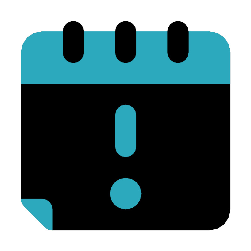 <svg fill="#000000" width="800px" height="800px" viewBox="0 0 24 24" id="calendar-alert-3" data-name="Flat Color" xmlns="http://www.w3.org/2000/svg" class="icon flat-color"><path id="primary" d="M22,5V20a2,2,0,0,1-2,2H5a1,1,0,0,1-.71-.29l-2-2A1,1,0,0,1,2,19V5A2,2,0,0,1,4,3H20A2,2,0,0,1,22,5Z" style="fill: rgb(0, 0, 0);"></path><path id="secondary" d="M22,5V8H2V5A2,2,0,0,1,4,3H20A2,2,0,0,1,22,5ZM12,17a1.5,1.5,0,1,0,1.5,1.5A1.5,1.5,0,0,0,12,17Zm1-3V11a1,1,0,0,0-2,0v3a1,1,0,0,0,2,0ZM2,19a1,1,0,0,0,.29.71l2,2A1,1,0,0,0,5,22V20a1,1,0,0,0-1-1Z" style="fill: rgb(44, 169, 188);"></path><path id="primary-2" data-name="primary" d="M17,6a1,1,0,0,1-1-1V3a1,1,0,0,1,2,0V5A1,1,0,0,1,17,6ZM13,5V3a1,1,0,0,0-2,0V5a1,1,0,0,0,2,0ZM8,5V3A1,1,0,0,0,6,3V5A1,1,0,0,0,8,5Z" style="fill: rgb(0, 0, 0);"></path></svg>