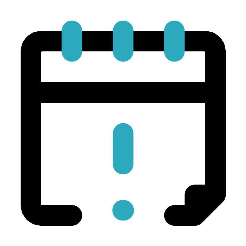 <svg fill="#000000" width="800px" height="800px" viewBox="0 0 24 24" id="calendar-alert-4" data-name="Line Color" xmlns="http://www.w3.org/2000/svg" class="icon line-color"><path id="primary" d="M7,21H4a1,1,0,0,1-1-1V5A1,1,0,0,1,4,4H20a1,1,0,0,1,1,1V19l-2,2H17" style="fill: none; stroke: rgb(0, 0, 0); stroke-linecap: round; stroke-linejoin: round; stroke-width: 2;"></path><polygon id="primary-2" data-name="primary" points="19 19 19 21 21 19 19 19" style="fill: none; stroke: rgb(0, 0, 0); stroke-linecap: round; stroke-linejoin: round; stroke-width: 2;"></polygon><line id="primary-3" data-name="primary" x1="3" y1="9" x2="21" y2="9" style="fill: none; stroke: rgb(0, 0, 0); stroke-linecap: round; stroke-linejoin: round; stroke-width: 2;"></line><path id="secondary" d="M17,3V5M12,3V5M7,3V5m5,8v3" style="fill: none; stroke-linecap: round; stroke-linejoin: round; stroke-width: 2; stroke: rgb(44, 169, 188);"></path><line id="secondary-upstroke" x1="12.05" y1="20.5" x2="11.95" y2="20.5" style="fill: none; stroke-linecap: round; stroke-linejoin: round; stroke-width: 2; stroke: rgb(44, 169, 188);"></line></svg>