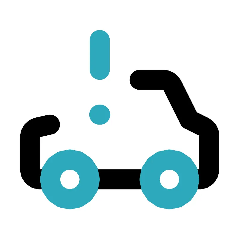 <svg fill="#000000" width="800px" height="800px" viewBox="0 0 24 24" id="car-alert-left" data-name="Line Color" xmlns="http://www.w3.org/2000/svg" class="icon line-color"><line id="secondary-upstroke" x1="10.05" y1="11.5" x2="9.95" y2="11.5" style="fill: none; stroke-linecap: round; stroke-linejoin: round; stroke-width: 2; stroke: rgb(44, 169, 188);"></line><path id="primary" d="M5,18H4a1,1,0,0,1-1-1V13.78a1,1,0,0,1,.76-1L5,12.5" style="fill: none; stroke: rgb(0, 0, 0); stroke-linecap: round; stroke-linejoin: round; stroke-width: 2;"></path><path id="primary-2" data-name="primary" d="M14,8h2.38a1,1,0,0,1,.9.55L19,12l1.45.72a1,1,0,0,1,.55.9V17a1,1,0,0,1-1,1H19" style="fill: none; stroke: rgb(0, 0, 0); stroke-linecap: round; stroke-linejoin: round; stroke-width: 2;"></path><line id="primary-3" data-name="primary" x1="9" y1="18" x2="15" y2="18" style="fill: none; stroke: rgb(0, 0, 0); stroke-linecap: round; stroke-linejoin: round; stroke-width: 2;"></line><path id="secondary" d="M17,20a2,2,0,1,0-2-2A2,2,0,0,0,17,20ZM7,20a2,2,0,1,0-2-2A2,2,0,0,0,7,20ZM10,7V4" style="fill: none; stroke-linecap: round; stroke-linejoin: round; stroke-width: 2; stroke: rgb(44, 169, 188);"></path></svg>