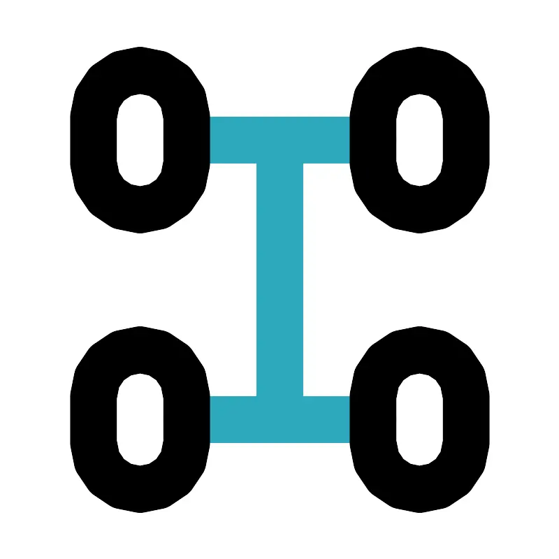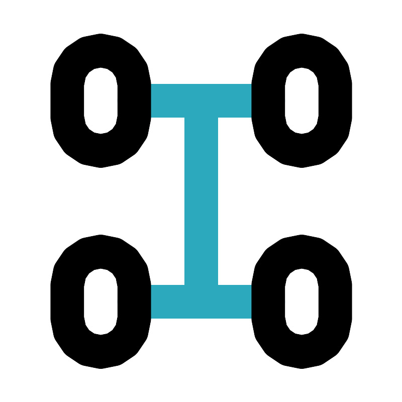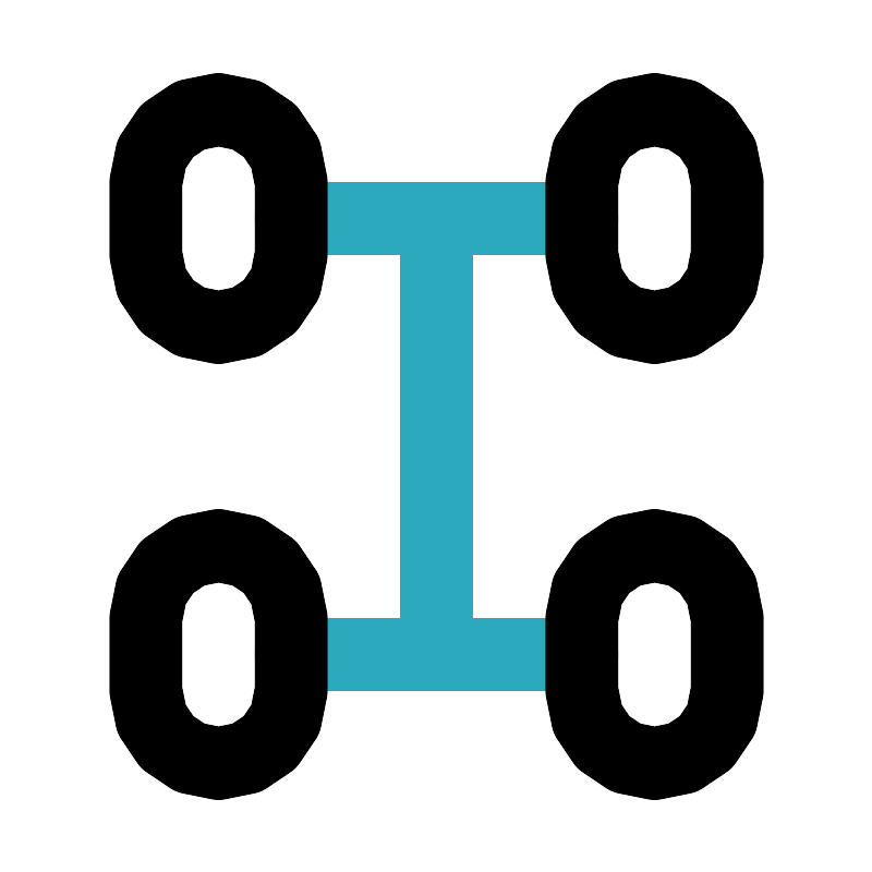 <svg fill="#000000" width="800px" height="800px" viewBox="0 0 24 24" id="chassis" data-name="Line Color" xmlns="http://www.w3.org/2000/svg" class="icon line-color"><path id="secondary" d="M8,6h8M8,18h8M12,6V18" style="fill: none; stroke: rgb(44, 169, 188); stroke-linecap: round; stroke-linejoin: round; stroke-width: 2;"></path><path id="primary" d="M18,9h0a2,2,0,0,1-2-2V5a2,2,0,0,1,2-2h0a2,2,0,0,1,2,2V7A2,2,0,0,1,18,9ZM8,7V5A2,2,0,0,0,6,3H6A2,2,0,0,0,4,5V7A2,2,0,0,0,6,9H6A2,2,0,0,0,8,7ZM20,19V17a2,2,0,0,0-2-2h0a2,2,0,0,0-2,2v2a2,2,0,0,0,2,2h0A2,2,0,0,0,20,19ZM8,19V17a2,2,0,0,0-2-2H6a2,2,0,0,0-2,2v2a2,2,0,0,0,2,2H6A2,2,0,0,0,8,19Z" style="fill: none; stroke: rgb(0, 0, 0); stroke-linecap: round; stroke-linejoin: round; stroke-width: 2;"></path></svg>