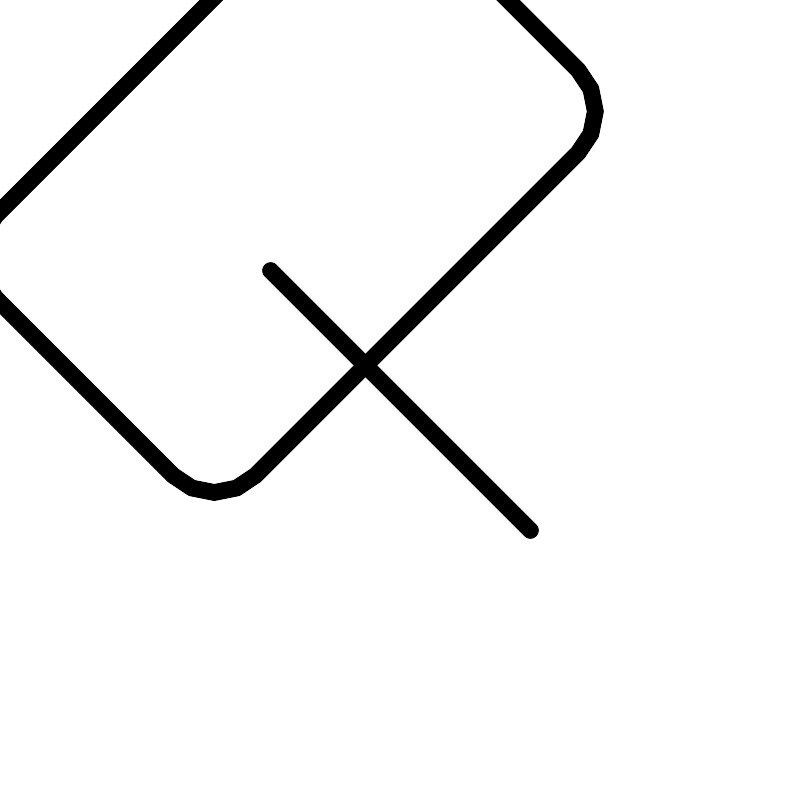 <svg width="800px" height="800px" viewBox="0 0 48 48" id="a" xmlns="http://www.w3.org/2000/svg"><defs><style>.b{fill:none;stroke:#000000;stroke-linecap:round;stroke-linejoin:round;}</style></defs><rect class="b" x="6.8084" y="12.9797" width="34.3832" height="22.0405" rx="3.5" ry="3.5" transform="translate(-9.9411 24) rotate(-45)"/><line class="b" x1="31.7925" y1="31.7925" x2="16.2075" y2="16.2075"/></svg>