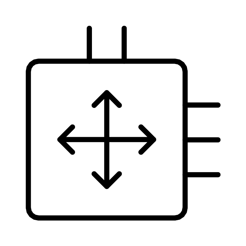 <svg width="800px" height="800px" viewBox="0 0 48 48" xmlns="http://www.w3.org/2000/svg"><defs><style>.a{fill:none;stroke:#000000;stroke-linecap:round;stroke-linejoin:round;}</style></defs><rect class="a" x="5.5" y="11.91" width="30.59" height="30.59" rx="2"/><line class="a" x1="36.09" y1="27.26" x2="42.5" y2="27.26"/><line class="a" x1="36.09" y1="20.47" x2="42.5" y2="20.47"/><line class="a" x1="36.09" y1="34.06" x2="42.5" y2="34.06"/><line class="a" x1="24.2" y1="11.91" x2="24.2" y2="5.5"/><line class="a" x1="17.4" y1="11.91" x2="17.4" y2="5.5"/><line class="a" x1="20.8" y1="36.34" x2="20.8" y2="18.06"/><polyline class="a" points="23.25 20.52 20.8 18.06 18.34 20.52"/><polyline class="a" points="18.34 33.89 20.8 36.34 23.25 33.89"/><line class="a" x1="11.66" y1="27.2" x2="29.94" y2="27.2"/><polyline class="a" points="27.48 29.66 29.94 27.2 27.48 24.75"/><polyline class="a" points="14.11 24.75 11.66 27.2 14.11 29.66"/></svg>