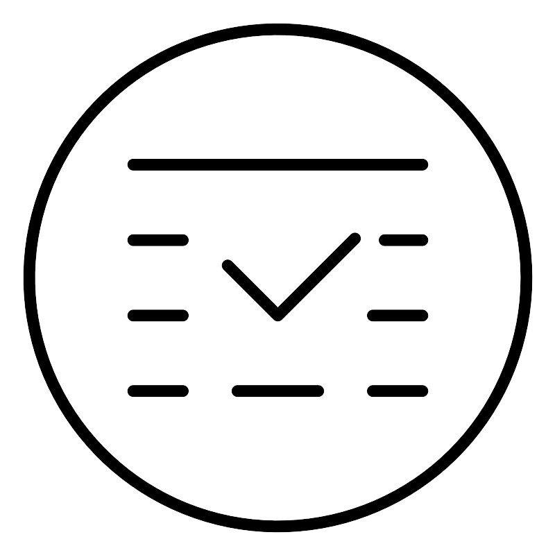 <svg width="800px" height="800px" viewBox="0 0 48 48" xmlns="http://www.w3.org/2000/svg"><defs><style>.a{fill:none;stroke:#000000;stroke-linecap:round;stroke-linejoin:round;}</style></defs><line class="a" x1="11.5" y1="14.21" x2="36.5" y2="14.21"/><line class="a" x1="11.5" y1="20.74" x2="15.78" y2="20.74"/><line class="a" x1="11.5" y1="27.26" x2="15.78" y2="27.26"/><line class="a" x1="11.5" y1="33.79" x2="15.78" y2="33.79"/><line class="a" x1="33.24" y1="20.74" x2="36.5" y2="20.74"/><line class="a" x1="32.22" y1="27.26" x2="36.5" y2="27.26"/><line class="a" x1="32.22" y1="33.79" x2="36.5" y2="33.79"/><line class="a" x1="20.51" y1="33.79" x2="27.49" y2="33.79"/><polyline class="a" points="19.66 22.93 24 27.26 30.67 20.6"/><circle class="a" cx="24" cy="24" r="21.5"/></svg>