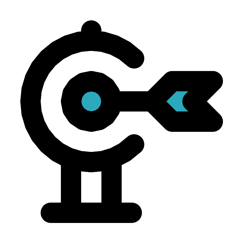 <svg fill="#000000" width="800px" height="800px" viewBox="0 0 24 24" id="dartboard-2" data-name="Flat Line" xmlns="http://www.w3.org/2000/svg" class="icon flat-line"><path id="secondary" d="M21,8l-2,2,2,2H17l-2-2,2-2ZM11,10a2,2,0,1,0-2,2A2,2,0,0,0,11,10Z" style="fill: rgb(44, 169, 188); stroke-width: 2;"></path><path id="primary" d="M15,10H11m6-2-2,2,2,2h4l-2-2,2-2ZM9,4V3M7,16v5m4-5v5M5,21h8M11,10a2,2,0,1,0-2,2A2,2,0,0,0,11,10Z" style="fill: none; stroke: rgb(0, 0, 0); stroke-linecap: round; stroke-linejoin: round; stroke-width: 2;"></path><path id="primary-2" data-name="primary" d="M13.23,5.75a6,6,0,1,0,0,8.5" style="fill: none; stroke: rgb(0, 0, 0); stroke-linecap: round; stroke-linejoin: round; stroke-width: 2;"></path></svg>