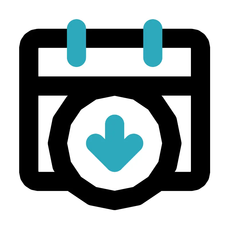 <svg fill="#000000" width="800px" height="800px" viewBox="0 0 24 24" id="date-alt-down" data-name="Line Color" xmlns="http://www.w3.org/2000/svg" class="icon line-color"><path id="primary" d="M7.54,19H4a1,1,0,0,1-1-1V5A1,1,0,0,1,4,4H20a1,1,0,0,1,1,1V18a1,1,0,0,1-1,1H16.46" style="fill: none; stroke: rgb(0, 0, 0); stroke-linecap: round; stroke-linejoin: round; stroke-width: 2;"></path><path id="primary-2" data-name="primary" d="M12,9a6,6,0,1,0,6,6A6,6,0,0,0,12,9ZM3,9H21" style="fill: none; stroke: rgb(0, 0, 0); stroke-linecap: round; stroke-linejoin: round; stroke-width: 2;"></path><path id="secondary" d="M16,3V6M8,3V6m4,11V13" style="fill: none; stroke: rgb(44, 169, 188); stroke-linecap: round; stroke-linejoin: round; stroke-width: 2;"></path><polyline id="secondary-2" data-name="secondary" points="10 15 12 17 14 15" style="fill: none; stroke: rgb(44, 169, 188); stroke-linecap: round; stroke-linejoin: round; stroke-width: 2;"></polyline></svg>