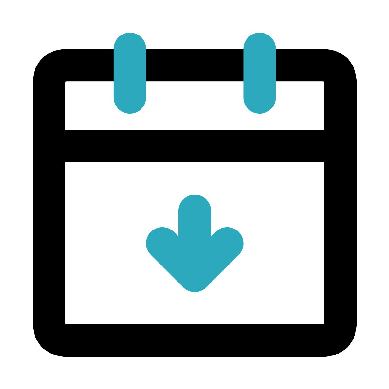 <svg fill="#000000" width="800px" height="800px" viewBox="0 0 24 24" id="date-down" data-name="Line Color" xmlns="http://www.w3.org/2000/svg" class="icon line-color"><path id="primary" d="M20,21H4a1,1,0,0,1-1-1V9H21V20A1,1,0,0,1,20,21ZM21,5a1,1,0,0,0-1-1H4A1,1,0,0,0,3,5V9H21Z" style="fill: none; stroke: rgb(0, 0, 0); stroke-linecap: round; stroke-linejoin: round; stroke-width: 2;"></path><path id="secondary" d="M16,3V6M8,3V6m4,11V13" style="fill: none; stroke: rgb(44, 169, 188); stroke-linecap: round; stroke-linejoin: round; stroke-width: 2;"></path><polyline id="secondary-2" data-name="secondary" points="10 15 12 17 14 15" style="fill: none; stroke: rgb(44, 169, 188); stroke-linecap: round; stroke-linejoin: round; stroke-width: 2;"></polyline></svg>