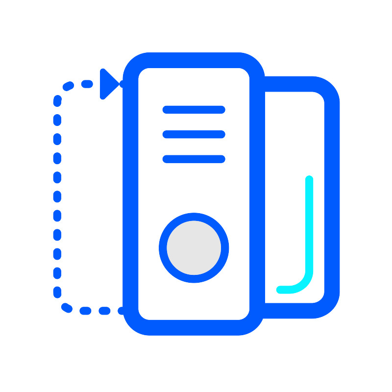 <svg width="800px" height="800px" viewBox="0 0 1024 1024" class="icon" version="1.1" xmlns="http://www.w3.org/2000/svg"><path d="M621.4 157.3h-231c-27.6 0-50 22.4-50 50V806c0 27.6 22.4 50 50 50h231c27.6 0 50-22.4 50-50V207.3c0-27.6-22.4-50-50-50zM813.7 219.6H671.4v592.5h142.4c29.3 0 53-22.4 53-50V269.6c-0.1-27.6-23.8-50-53.1-50z" fill="#FFFFFF" /><path d="M148.8 478c5.5 0 10-4.5 10-10v-10c0-5.5-4.5-10-10-10s-10 4.5-10 10v10c0 5.5 4.5 10 10 10zM148.8 528c5.5 0 10-4.5 10-10v-10c0-5.5-4.5-10-10-10s-10 4.5-10 10v10c0 5.5 4.5 10 10 10zM148.8 628c5.5 0 10-4.5 10-10v-10c0-5.5-4.5-10-10-10s-10 4.5-10 10v10c0 5.5 4.5 10 10 10zM148.8 578c5.5 0 10-4.5 10-10v-10c0-5.5-4.5-10-10-10s-10 4.5-10 10v10c0 5.5 4.5 10 10 10zM148.8 328c5.5 0 10-4.5 10-10v-10c0-5.5-4.5-10-10-10s-10 4.5-10 10v10c0 5.5 4.5 10 10 10zM148.8 378c5.5 0 10-4.5 10-10v-10c0-5.5-4.5-10-10-10s-10 4.5-10 10v10c0 5.5 4.5 10 10 10zM148.6 278h0.2c5.4 0 9.9-4.4 10-9.8 0-2.6 0.4-5.3 1-7.8 1.3-5.4-2.1-10.8-7.5-12-5.4-1.3-10.8 2.1-12 7.5-0.9 3.9-1.4 7.9-1.5 12-0.1 5.5 4.3 10 9.8 10.1zM148.8 678c5.5 0 10-4.5 10-10v-10c0-5.5-4.5-10-10-10s-10 4.5-10 10v10c0 5.5 4.5 10 10 10zM148.8 428c5.5 0 10-4.5 10-10v-10c0-5.5-4.5-10-10-10s-10 4.5-10 10v10c0 5.5 4.5 10 10 10zM148.8 728c5.5 0 10-4.5 10-10v-10c0-5.5-4.5-10-10-10s-10 4.5-10 10v10c0 5.5 4.5 10 10 10zM231.8 208.9h-10c-5.5 0-10 4.5-10 10s4.5 10 10 10h10c5.5 0 10-4.5 10-10s-4.5-10-10-10zM277.5 801.4h-10c-5.5 0-10 4.5-10 10s4.5 10 10 10h10c5.5 0 10-4.5 10-10s-4.5-10-10-10zM227.5 801.4h-10c-5.5 0-10 4.5-10 10s4.5 10 10 10h10c5.5 0 10-4.5 10-10s-4.5-10-10-10zM178.7 213.1c-3.7 1.4-7.3 3.1-10.6 5.2-4.7 2.9-6.2 9-3.4 13.7 1.9 3.1 5.2 4.8 8.6 4.8 1.8 0 3.6-0.5 5.2-1.4 2.3-1.4 4.8-2.6 7.3-3.6 5.2-1.9 7.8-7.7 5.8-12.9-2-5.1-7.8-7.7-12.9-5.8zM158.8 761.4V758c0-5.5-4.5-10-10-10s-10 4.5-10 10v3.4c0 2.7 0.2 5.4 0.6 8 0.7 5 5 8.6 9.9 8.6 0.5 0 0.9 0 1.4-0.1 5.5-0.8 9.3-5.8 8.5-11.3-0.3-1.7-0.4-3.5-0.4-5.2zM182.5 797.2c-2.5-1.2-4.8-2.5-7-4.1-4.5-3.2-10.7-2.2-14 2.3-3.2 4.5-2.2 10.7 2.3 14 3.2 2.3 6.6 4.3 10.2 6 1.4 0.6 2.8 0.9 4.2 0.9 3.8 0 7.4-2.1 9.1-5.8 2.3-5 0.2-11-4.8-13.3zM813.7 198.9H690.9c-3.9-35-33.6-62.3-69.6-62.3h-231c-38.6 0-70 31.4-70 70v2.4c-4.7 0.6-8.3 4.5-8.6 9.3l-38.3-37.6c-4.5-4.4-12.3-1.3-12.3 4.9l-0.4 66.5c0 6.2 7.7 9.4 12.2 5l38.7-37.2c0.5 4.6 4 8.2 8.5 8.9v572.6h-2.9c-5.5 0-10 4.5-10 10s4.5 10 10 10h4.8c7.3 30.9 35 54 68.1 54h231c29.4 0 54.6-18.2 65-44h127.4c40.2 0 73-31.4 73-70V268.9c0.2-38.6-32.5-70-72.8-70zM651.4 805.4c0 16.5-13.5 30-30 30h-231c-16.5 0-30-13.5-30-30V206.7c0-16.5 13.5-30 30-30h231c16.5 0 30 13.5 30 30v598.7z m195.3-44c0 16.5-14.8 30-33 30H691.4V238.9h122.4c18.2 0 33 13.5 33 30v492.5z" fill="#005BFF" /><path d="M754.2 766.4h-22.9c-5.5 0-10-4.5-10-10s4.5-10 10-10h22.9c23.7 0 43-17.9 43-40V468.2c0-5.5 4.5-10 10-10s10 4.5 10 10v238.2c0 33.1-28.3 60-63 60z" fill="#06F3FF" /><path d="M577.5 295.9H434.2c-5.5 0-10-4.5-10-10s4.5-10 10-10h143.2c5.5 0 10 4.5 10 10s-4.4 10-9.9 10z" fill="#005BFF" /><path d="M577.5 360.4H434.2c-5.5 0-10-4.5-10-10s4.5-10 10-10h143.2c5.5 0 10 4.5 10 10s-4.4 10-9.9 10z" fill="#005BFF" /><path d="M577.5 424.9H434.2c-5.5 0-10-4.5-10-10s4.5-10 10-10h143.2c5.5 0 10 4.5 10 10s-4.4 10-9.9 10z" fill="#005BFF" /><path d="M505.9 575.6c-39.3 0-71.3 32-71.3 71.3s32 71.3 71.3 71.3 71.3-32 71.3-71.3-32-71.3-71.3-71.3z" fill="#E6E6E6" /><path d="M505.9 555.6c-50.4 0-91.3 41-91.3 91.3s41 91.3 91.3 91.3 91.3-41 91.3-91.3-41-91.3-91.3-91.3z m0 162.6c-39.3 0-71.3-32-71.3-71.3s32-71.3 71.3-71.3 71.3 32 71.3 71.3-32 71.3-71.3 71.3z" fill="#005BFF" /></svg>