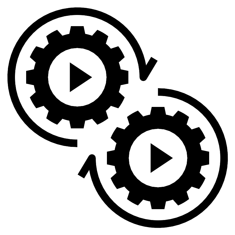 <svg fill="#000000" width="800px" height="800px" viewBox="0 0 64 64" data-name="Layer 1" id="Layer_1" xmlns="http://www.w3.org/2000/svg"><title/><path d="M15.51935,33.88483l1.43323-1.59967a11.88788,11.88788,0,0,0,1.90319.51294l.43885,2.08783h3.4107l.43878-2.08783a11.88545,11.88545,0,0,0,1.90314-.51288L26.48041,33.885a13.96613,13.96613,0,0,0,2.93615-1.71643l-.66284-2.01831A12.06871,12.06871,0,0,0,30.14984,28.754l2.01837.663a13.96389,13.96389,0,0,0,1.71662-2.93634l-1.59961-1.43323a11.88774,11.88774,0,0,0,.51288-1.90319l2.08783-.43885v-3.4107L32.7981,18.8559a11.879,11.879,0,0,0-.51282-1.90314L33.885,15.51959a13.96613,13.96613,0,0,0-1.71643-2.93615l-2.01831.66284A12.064,12.064,0,0,0,28.754,11.85016l.663-2.01837a13.96389,13.96389,0,0,0-2.93634-1.71662L25.04742,9.71478a11.88774,11.88774,0,0,0-1.90319-.51288l-.43885-2.08783h-3.4107L18.8559,9.2019a11.88531,11.88531,0,0,0-1.90314.51282L15.51959,8.11505a13.96462,13.96462,0,0,0-2.93615,1.71643l.66284,2.01831A12.064,12.064,0,0,0,11.85016,13.246l-2.01837-.663a13.96322,13.96322,0,0,0-1.71656,2.93628l1.59961,1.43322a11.87909,11.87909,0,0,0-.51287,1.9032l-2.0879.43885v3.41076l2.08783.43878a11.87733,11.87733,0,0,0,.51282,1.90314L8.11505,26.48041a13.96613,13.96613,0,0,0,1.71643,2.93615l2.01831-.66284A12.064,12.064,0,0,0,13.246,30.14984l-.663,2.01837A13.96389,13.96389,0,0,0,15.51935,33.88483ZM13,21a8,8,0,1,1,8,8A8,8,0,0,1,13,21Z"/><polygon points="19 17 19 25 25 21 19 17"/><path d="M48.48065,30.11517l-1.43323,1.59961a11.88774,11.88774,0,0,0-1.90319-.51288l-.43885-2.08783h-3.4107L40.8559,31.2019a11.88531,11.88531,0,0,0-1.90314.51282l-1.43317-1.59967a13.96462,13.96462,0,0,0-2.93615,1.71643l.66284,2.01831A12.064,12.064,0,0,0,33.85016,35.246l-2.01837-.663a13.96322,13.96322,0,0,0-1.71656,2.93628l1.59961,1.43322a11.87909,11.87909,0,0,0-.51287,1.9032l-2.0879.43885v3.41076l2.08783.43878a11.87733,11.87733,0,0,0,.51282,1.90314l-1.59967,1.43317a13.96613,13.96613,0,0,0,1.71643,2.93615l2.01831-.66284A12.064,12.064,0,0,0,35.246,52.14984l-.663,2.01837a13.96389,13.96389,0,0,0,2.93634,1.71662l1.43323-1.59967a11.88788,11.88788,0,0,0,1.90319.51294l.43885,2.08783h3.4107l.43878-2.08783a11.88545,11.88545,0,0,0,1.90314-.51288L48.48041,55.885a13.96613,13.96613,0,0,0,2.93615-1.71643l-.66284-2.01831A12.06871,12.06871,0,0,0,52.14984,50.754l2.01837.663a13.96389,13.96389,0,0,0,1.71662-2.93634l-1.59961-1.43323a11.88774,11.88774,0,0,0,.51288-1.90319l2.08783-.43885v-3.4107L54.7981,40.8559a11.879,11.879,0,0,0-.51282-1.90314L55.885,37.51959a13.96613,13.96613,0,0,0-1.71643-2.93615l-2.01831.66284A12.064,12.064,0,0,0,50.754,33.85016l.663-2.01837A13.96389,13.96389,0,0,0,48.48065,30.11517ZM51,43a8,8,0,1,1-8-8A8,8,0,0,1,51,43Z"/><polygon points="41 47 47 43 41 39 41 47"/><path d="M24.26465,46.16992A19.00075,19.00075,0,1,0,43,24v2A17,17,0,1,1,26,43a1,1,0,0,0-1.85742-.51465l-3,5,1.71484,1.0293Z"/><path d="M21,40V38A17,17,0,1,1,38,21a1,1,0,0,0,1.85742.51465l3-5-1.71484-1.0293-1.40723,2.34473A19.00075,19.00075,0,1,0,21,40Z"/></svg>