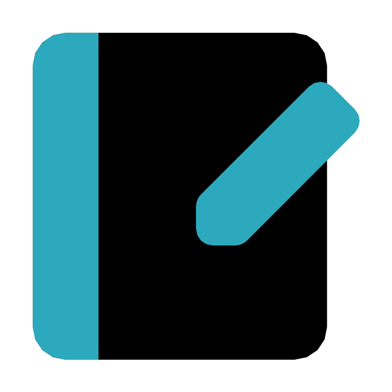 <svg fill="#000000" width="800px" height="800px" viewBox="0 0 24 24" id="diary" data-name="Flat Color" xmlns="http://www.w3.org/2000/svg" class="icon flat-color"><rect id="primary" x="2" y="2" width="18" height="20" rx="2" style="fill: rgb(0, 0, 0);"></rect><path id="secondary" d="M4,2H6V22H4a2,2,0,0,1-2-2V4A2,2,0,0,1,4,2ZM18.91,5.29,12.29,11.9a1.05,1.05,0,0,0-.29.71V14a1,1,0,0,0,1,1h1.39a1.05,1.05,0,0,0,.71-.29l6.61-6.62a1,1,0,0,0,0-1.4l-1.4-1.4A1,1,0,0,0,18.91,5.29Z" style="fill: rgb(44, 169, 188);"></path></svg>