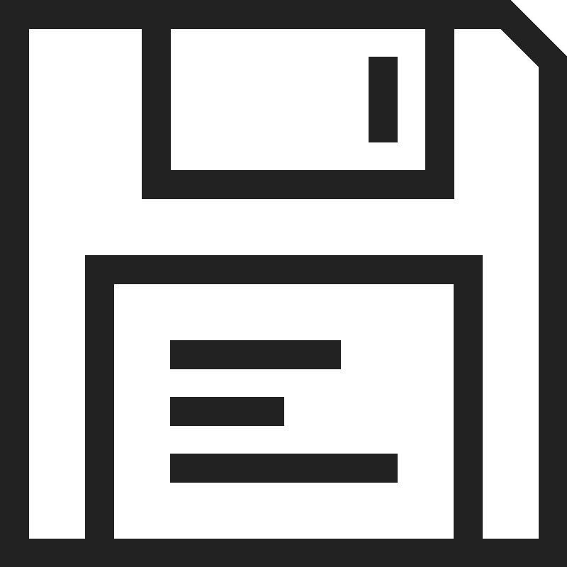 <path d="M 0 0 L 0 20 L 20 20 L 20 2 L 18 0 L 0 0 z M 1 1 L 5 1 L 5 7 L 16 7 L 16 1 L 17.646484 1 L 19 2.3535156 L 19 19 L 17 19 L 17 9 L 3 9 L 3 19 L 1 19 L 1 1 z M 6 1 L 15 1 L 15 6 L 6 6 L 6 1 z M 13 2 L 13 5 L 14 5 L 14 2 L 13 2 z M 4 10 L 16 10 L 16 19 L 4 19 L 4 10 z M 6 12 L 6 13 L 12 13 L 12 12 L 6 12 z M 6 14 L 6 15 L 10 15 L 10 14 L 6 14 z M 6 16 L 6 17 L 14 17 L 14 16 L 6 16 z " style="fill:#222222; fill-opacity:1; stroke:none; stroke-width:0px;"/>