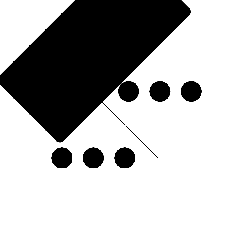 <svg width="800px" height="800px" viewBox="0 0 48 48" id="b" xmlns="http://www.w3.org/2000/svg"><defs><style>.c{stroke-width:1px;}.c,.d{fill:none;stroke:#000000;stroke-linecap:round;stroke-linejoin:round;}</style></defs><rect class="c" x="6.052" y="15.2661" width="35.9102" height="17.4701" rx=".9" ry=".9" transform="translate(-9.9399 24.0053) rotate(-45)"/><line class="d" x1="17.82" y1="17.82" x2="30.18" y2="30.18"/><circle class="d" cx="30.55" cy="17.45" r="2"/><circle class="d" cx="36.5501" cy="17.45" r="2"/><circle class="d" cx="24.55" cy="17.45" r="2"/><circle class="d" cx="17.82" cy="30.18" r="2"/><circle class="d" cx="23.82" cy="30.18" r="2"/><circle class="d" cx="11.8199" cy="30.18" r="2"/></svg>
