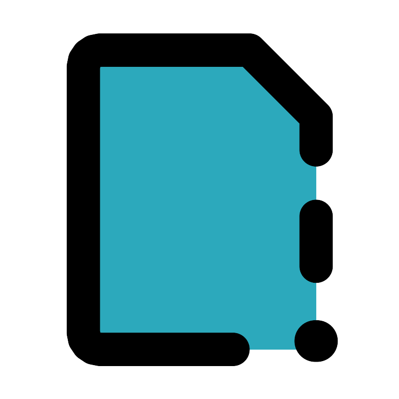 <svg fill="#000000" width="800px" height="800px" viewBox="0 0 24 24" id="file-error" data-name="Flat Line" xmlns="http://www.w3.org/2000/svg" class="icon flat-line"><path id="secondary" d="M18,21a1,1,0,0,0,1-1V7L15,3H6A1,1,0,0,0,5,4V20a1,1,0,0,0,1,1Z" style="fill: rgb(44, 169, 188); stroke-width: 2;"></path><line id="primary" x1="19" y1="16" x2="19" y2="13" style="fill: none; stroke: rgb(0, 0, 0); stroke-linecap: round; stroke-linejoin: round; stroke-width: 2;"></line><path id="primary-2" data-name="primary" d="M19,9V7L15,3H6A1,1,0,0,0,5,4V20a1,1,0,0,0,1,1h8" style="fill: none; stroke: rgb(0, 0, 0); stroke-linecap: round; stroke-linejoin: round; stroke-width: 2;"></path><line id="primary-upstroke" x1="18.95" y1="20.5" x2="19.05" y2="20.5" style="fill: none; stroke: rgb(0, 0, 0); stroke-linecap: round; stroke-linejoin: round; stroke-width: 2.5;"></line></svg>