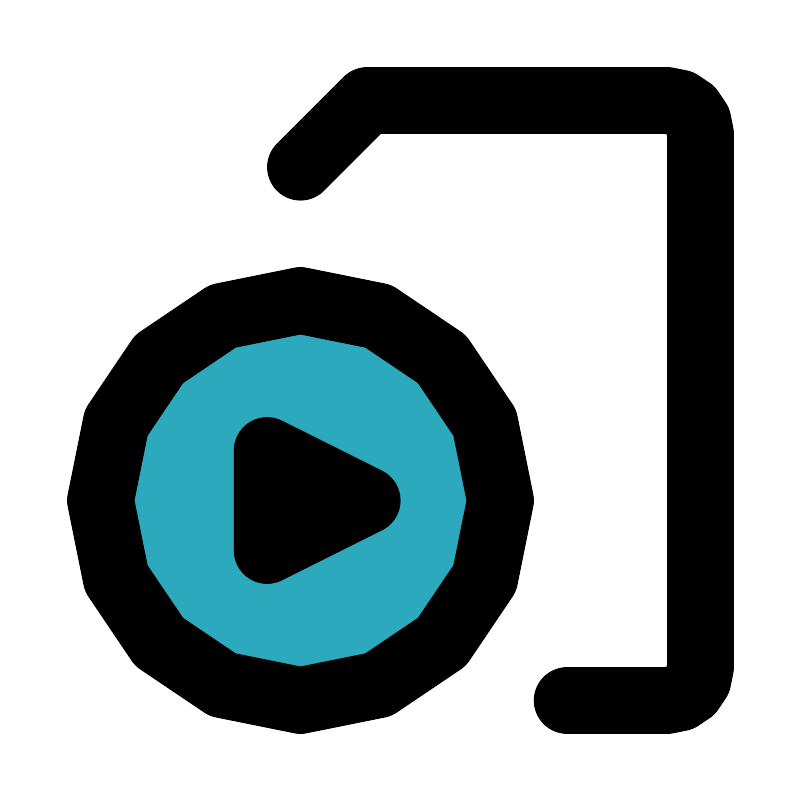 <svg fill="#000000" width="800px" height="800px" viewBox="0 0 24 24" id="file-video-player-4" data-name="Flat Line" xmlns="http://www.w3.org/2000/svg" class="icon flat-line"><path id="secondary" d="M9,9a6,6,0,1,0,6,6A6,6,0,0,0,9,9ZM8,16.5v-3L11,15Z" style="fill: rgb(44, 169, 188); stroke-width: 2;"></path><path id="primary" d="M9,21a6,6,0,1,0-6-6A6,6,0,0,0,9,21Zm2-6L8,13.5v3Z" style="fill: none; stroke: rgb(0, 0, 0); stroke-linecap: round; stroke-linejoin: round; stroke-width: 2;"></path><path id="primary-2" data-name="primary" d="M9,5l2-2h9a1,1,0,0,1,1,1V20a1,1,0,0,1-1,1H17" style="fill: none; stroke: rgb(0, 0, 0); stroke-linecap: round; stroke-linejoin: round; stroke-width: 2;"></path></svg>