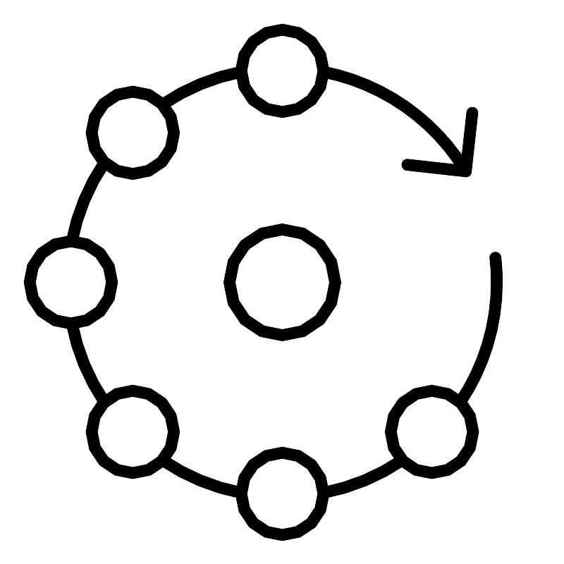 <svg width="800px" height="800px" viewBox="0 0 48 48" xmlns="http://www.w3.org/2000/svg"><defs><style>.a{fill:none;stroke:#000000;stroke-linecap:round;stroke-linejoin:round;}</style></defs><circle class="a" cx="24" cy="24" r="4.5"/><circle class="a" cx="24" cy="6" r="3.5"/><circle class="a" cx="24" cy="42" r="3.5"/><circle class="a" cx="11.2721" cy="36.7279" r="3.5"/><circle class="a" cx="11.2721" cy="11.2721" r="3.5"/><circle class="a" cx="36.7279" cy="36.7279" r="3.5"/><circle class="a" cx="6" cy="24" r="3.5"/><path class="a" d="M27.4841,41.9178a18.1473,18.1473,0,0,0,6.7212-2.7857"/><path class="a" d="M13.7947,39.1321a18.1473,18.1473,0,0,0,6.7212,2.7857"/><path class="a" d="M6.085,27.4988a18.149,18.149,0,0,0,2.7829,6.7065"/><path class="a" d="M8.8593,13.8074A18.1478,18.1478,0,0,0,6.085,20.5012"/><path class="a" d="M20.5,6.0853A18.1479,18.1479,0,0,0,13.8069,8.86"/><path class="a" d="M39.6141,14.547A18.2693,18.2693,0,0,0,27.4986,6.085"/><path class="a" d="M39.1321,34.2053A18.1646,18.1646,0,0,0,42.25,24a18.4549,18.4549,0,0,0-.1186-2.092"/><polyline class="a" points="40.165 9.577 39.614 14.547 34.645 13.996"/></svg>