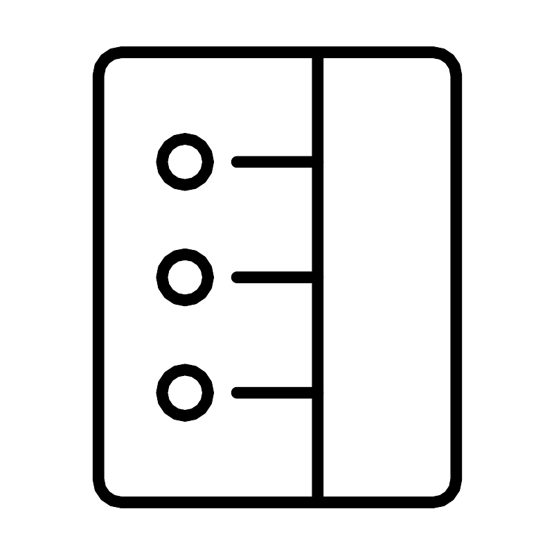 <svg width="800px" height="800px" viewBox="0 0 48 48" xmlns="http://www.w3.org/2000/svg"><defs><style>.a{fill:none;stroke:#000000;stroke-linecap:round;stroke-linejoin:round;}</style></defs><path class="a" d="M10.5,43.5h27a2,2,0,0,0,2-2V6.5a2,2,0,0,0-2-2h-27a2,2,0,0,0-2,2v35A2,2,0,0,0,10.5,43.5Z"/><line class="a" x1="27.5" y1="4.5" x2="27.5" y2="43.5"/><line class="a" x1="20.5" y1="24" x2="27.5" y2="24"/><circle class="a" cx="16" cy="24" r="2"/><line class="a" x1="20.5" y1="14" x2="27.5" y2="14"/><circle class="a" cx="16" cy="14" r="2"/><line class="a" x1="20.5" y1="34" x2="27.5" y2="34"/><circle class="a" cx="16" cy="34" r="2"/></svg>