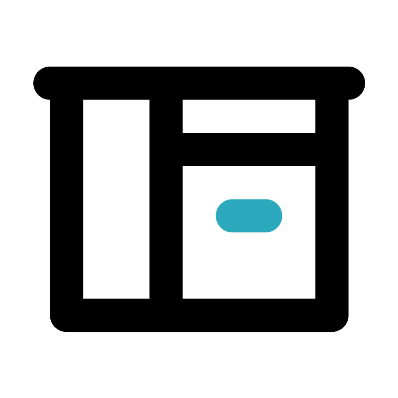 <svg fill="#000000" width="800px" height="800px" viewBox="0 0 24 24" id="kitchen-cabinet-3" data-name="Line Color" xmlns="http://www.w3.org/2000/svg" class="icon line-color"><line id="secondary" x1="16" y1="13" x2="14" y2="13" style="fill: none; stroke: rgb(44, 169, 188); stroke-linecap: round; stroke-linejoin: round; stroke-width: 2;"></line><path id="primary" d="M4,19H20V5H4ZM3,5H21M4,19h6V5H4ZM10,9H20V5H10Z" style="fill: none; stroke: rgb(0, 0, 0); stroke-linecap: round; stroke-linejoin: round; stroke-width: 2;"></path></svg>
