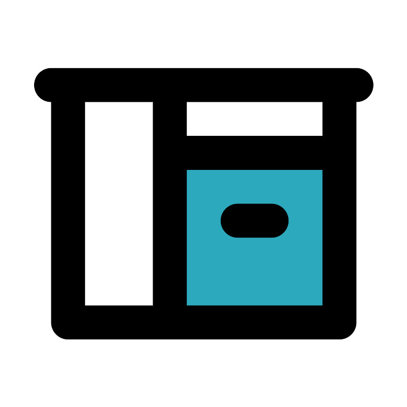 <svg fill="#000000" width="800px" height="800px" viewBox="0 0 24 24" id="kitchen-cabinet-3" data-name="Flat Line" xmlns="http://www.w3.org/2000/svg" class="icon flat-line"><rect id="secondary" x="10" y="9" width="10" height="10" style="fill: rgb(44, 169, 188); stroke-width: 2;"></rect><path id="primary" d="M16,13H14M4,19H20V5H4ZM3,5H21M4,19h6V5H4ZM10,9H20V5H10Z" style="fill: none; stroke: rgb(0, 0, 0); stroke-linecap: round; stroke-linejoin: round; stroke-width: 2;"></path></svg>