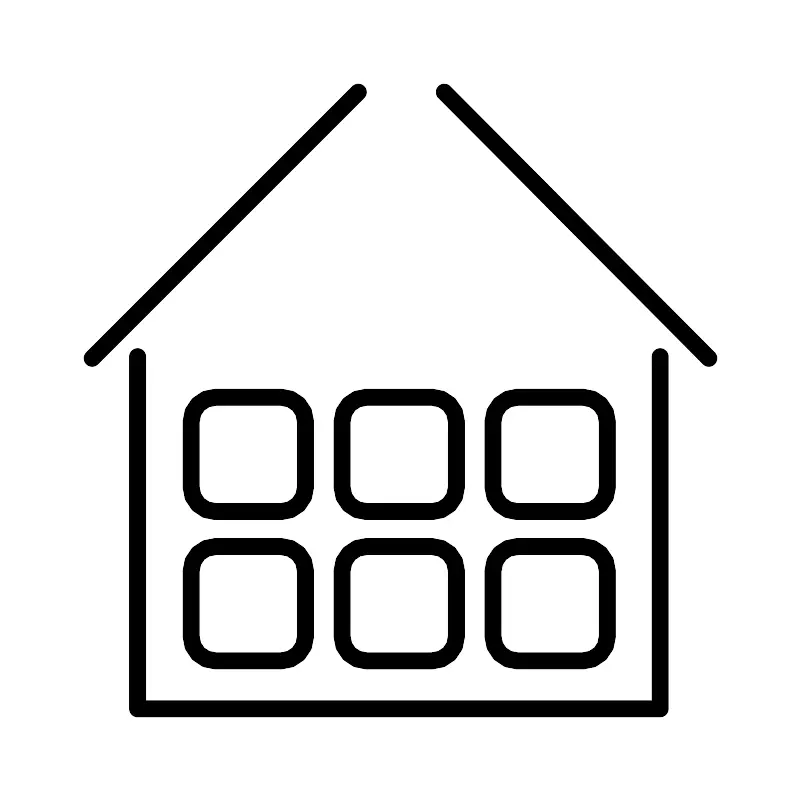 <svg width="800px" height="800px" viewBox="0 0 48 48" xmlns="http://www.w3.org/2000/svg"><defs><style>.a{fill:none;stroke:#000000;stroke-linecap:round;stroke-linejoin:round;}</style></defs><path class="a" d="M5.5,21.4684,21.4684,5.5"/><path class="a" d="M26.6289,5.5,42.5,21.4684"/><path class="a" d="M8.2263,21.3711V42.5H39.5789V21.3711"/><rect class="a" x="11.4395" y="23.8053" width="6.8596" height="6.8596" rx="1.4605"/><rect class="a" x="20.4947" y="23.8053" width="6.8596" height="6.8596" rx="1.4605"/><rect class="a" x="29.55" y="23.8053" width="6.8596" height="6.8596" rx="1.4605"/><rect class="a" x="11.4395" y="32.7632" width="6.8596" height="6.8596" rx="1.4605"/><rect class="a" x="20.4947" y="32.7632" width="6.8596" height="6.8596" rx="1.4605"/><rect class="a" x="29.55" y="32.7632" width="6.8596" height="6.8596" rx="1.4605"/></svg>