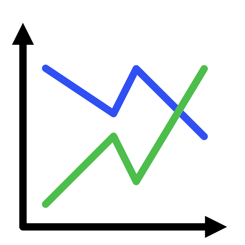 <svg width="800px" height="800px" viewBox="0 -1.5 2253 2253" style="fill-rule:evenodd;clip-rule:evenodd;stroke-linecap:round;stroke-linejoin:round;stroke-miterlimit:1.5;" version="1.1" xml:space="preserve" xmlns="http://www.w3.org/2000/svg" xmlns:serif="http://www.serif.com/" xmlns:xlink="http://www.w3.org/1999/xlink"><rect height="2250" id="line_chart_against" style="fill:none;" width="2250" x="1.288" y="0"/><path d="M309.621,408.333l-100,-200l-100,200l200,0Z"/><path d="M1884.62,1983.33l200,100l-200,100l-0,-200Z"/><path d="M209.621,368.333l-0,1715l1715,0" style="fill:none;stroke:#000000;stroke-width:66.67px;"/><path d="M417.954,625l625,416.667l208.334,-412.5l625,622.916" style="fill:none;stroke:#3050f3;stroke-width:66.67px;"/><path d="M417.954,1875l625,-625l208.334,416.667l625,-1037.5" style="fill:none;stroke:#ffffff;stroke-width:66.67px;"/><path d="M417.954,1875l625,-625l208.334,416.667l625,-1037.5" style="fill:none;stroke:#4dbe4b;stroke-width:66.67px;"/></svg>