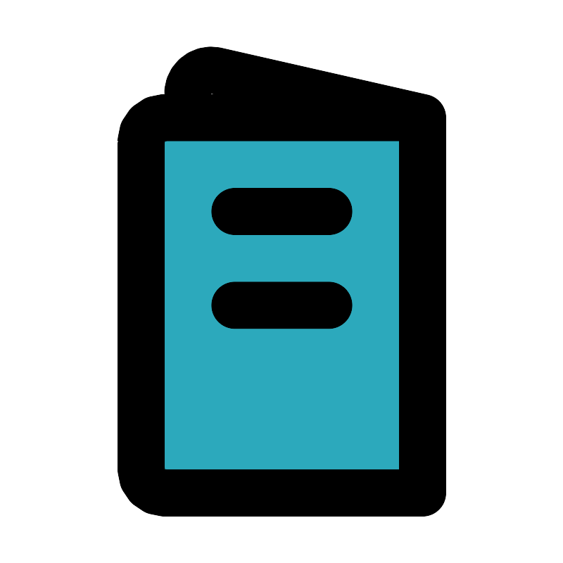 <svg fill="#000000" width="800px" height="800px" viewBox="0 0 24 24" id="menu-food-left" data-name="Flat Line" xmlns="http://www.w3.org/2000/svg" class="icon flat-line"><path id="secondary" d="M6,5H17a1,1,0,0,1,1,1V20a1,1,0,0,1-1,1H6a0,0,0,0,1,0,0V5A0,0,0,0,1,6,5Z" transform="translate(24 26) rotate(180)" style="fill: rgb(44, 169, 188); stroke-width: 2;"></path><path id="primary" d="M10,9h4m-4,4h4M7,5H18V21H7a1,1,0,0,1-1-1V6A1,1,0,0,1,7,5ZM18,5,9.2,3A1,1,0,0,0,8,4.12V5Z" style="fill: none; stroke: rgb(0, 0, 0); stroke-linecap: round; stroke-linejoin: round; stroke-width: 2;"></path></svg>
