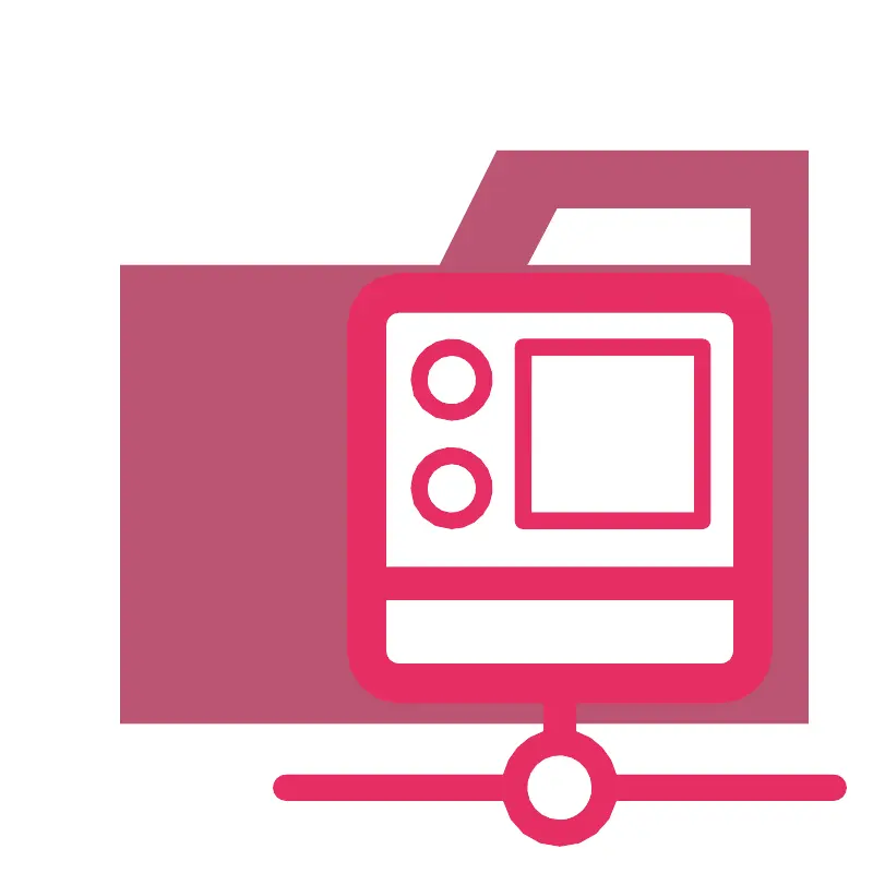 <svg width="800px" height="800px" viewBox="0 0 32 32" xmlns="http://www.w3.org/2000/svg"><title>folder_type_middleware</title><path d="M27.5,5.5H18.2L16.1,9.7H4.4V26.5H29.6V5.5Zm0,4.2H19.3l1.1-2.1h7.1Z" style="fill:#bc5572"/><path d="M27.109,24.557H13.89V11.193H27.109ZM20.5,27.54a1.313,1.313,0,1,0,1.3,1.312A1.3,1.3,0,0,0,20.5,27.54Z" style="fill:#ffffff;stroke:#000000;stroke-miterlimit:10;stroke-width:0.12306608451093866px"/><path d="M16.521,15.393A1.492,1.492,0,1,0,15.046,13.9,1.485,1.485,0,0,0,16.521,15.393Zm0-2.386a.9.9,0,1,1-.885.895A.891.891,0,0,1,16.521,13.007Zm0,6.359a1.491,1.491,0,1,0-1.475-1.491A1.485,1.485,0,0,0,16.521,19.366Zm0-2.386a.9.9,0,1,1-.885.895A.891.891,0,0,1,16.521,16.98Zm2.636,2.386h6.566a.3.3,0,0,0,.3-.3v-6.36a.3.3,0,0,0-.3-.3H19.157a.3.3,0,0,0-.3.3v6.36A.3.3,0,0,0,19.157,19.366Zm.3-6.359h5.976V18.77H19.452Zm11.08,15.372H22.571a2.143,2.143,0,0,0-1.481-1.588V25.75H26.4a1.9,1.9,0,0,0,1.889-1.909V11.909A1.9,1.9,0,0,0,26.4,10H14.6a1.9,1.9,0,0,0-1.889,1.909V23.841A1.9,1.9,0,0,0,14.6,25.75H19.91v1.041a2.143,2.143,0,0,0-1.481,1.588H10.468a.473.473,0,0,0,0,.946h7.961a2.118,2.118,0,0,0,4.142,0h7.961a.473.473,0,0,0,0-.946ZM14.6,11.432H26.4a.48.48,0,0,1,.472.477v8.86H14.127v-8.86A.48.48,0,0,1,14.6,11.432Zm-.472,12.409V21.962H26.873v1.879a.48.48,0,0,1-.472.477H14.6A.48.48,0,0,1,14.127,23.841Zm6.373,6.2a1.193,1.193,0,1,1,1.18-1.193A1.186,1.186,0,0,1,20.5,30.045Z" style="fill:#e52e62"/></svg>