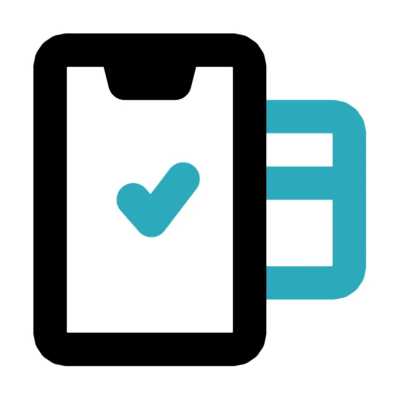 <svg fill="#000000" width="800px" height="800px" viewBox="0 0 24 24" id="mobile-payment-done" data-name="Line Color" xmlns="http://www.w3.org/2000/svg" class="icon line-color"><path id="secondary" d="M20,17H15V7h5a1,1,0,0,1,1,1v8A1,1,0,0,1,20,17Zm-5-6h6" style="fill: none; stroke: rgb(44, 169, 188); stroke-linecap: round; stroke-linejoin: round; stroke-width: 2;"></path><polyline id="secondary-2" data-name="secondary" points="8 12 9.09 13.25 11 10.75" style="fill: none; stroke: rgb(44, 169, 188); stroke-linecap: round; stroke-linejoin: round; stroke-width: 2;"></polyline><path id="primary" d="M15,20V4a1,1,0,0,0-1-1H4A1,1,0,0,0,3,4V20a1,1,0,0,0,1,1H14A1,1,0,0,0,15,20ZM11,3H7l.5,2h3Z" style="fill: none; stroke: rgb(0, 0, 0); stroke-linecap: round; stroke-linejoin: round; stroke-width: 2;"></path></svg>