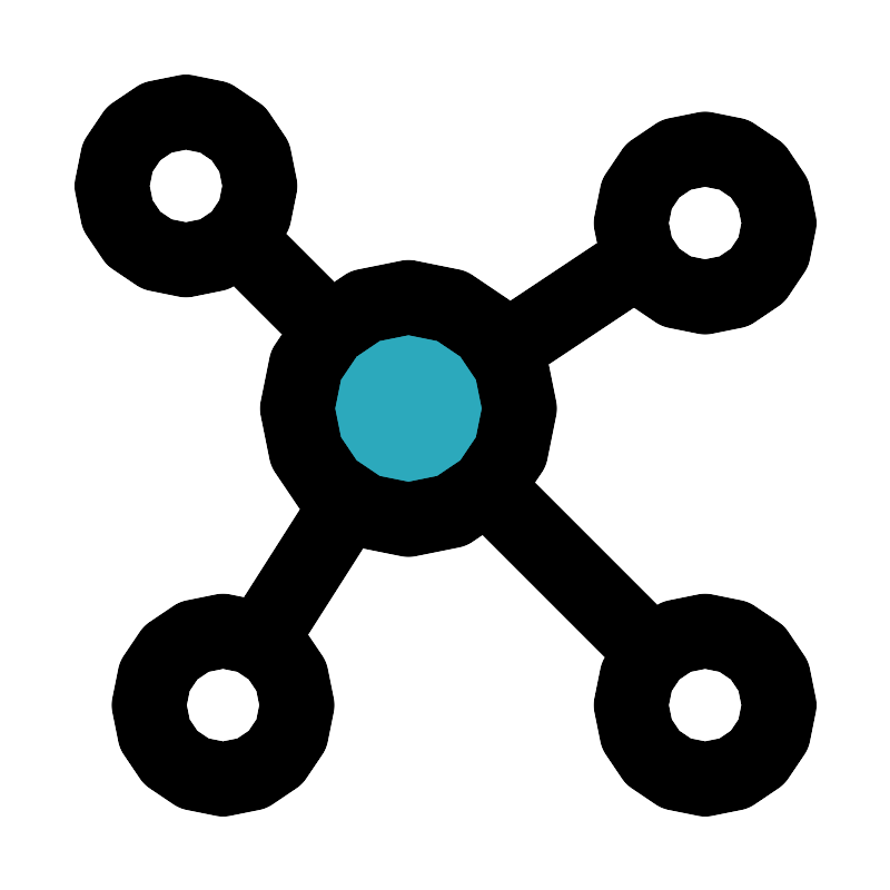 <svg fill="#000000" width="800px" height="800px" viewBox="0 0 24 24" id="molecule-3" data-name="Flat Line" xmlns="http://www.w3.org/2000/svg" class="icon flat-line"><circle id="secondary" cx="11" cy="11" r="3" style="fill: rgb(44, 169, 188); stroke-width: 2;"></circle><path id="primary" d="M13.32,13.32l4.27,4.27M8.74,8.74,7,7m2.28,6.69L7,17.27m6.79-8L17.2,7M11,14a3,3,0,1,1,3-3A3,3,0,0,1,11,14Zm8,7a2,2,0,1,1,2-2A2,2,0,0,1,19,21ZM5,3A2,2,0,1,1,3,5,2,2,0,0,1,5,3ZM6,17a2,2,0,1,1-2,2A2,2,0,0,1,6,17ZM19,4a2,2,0,1,1-2,2A2,2,0,0,1,19,4Z" style="fill: none; stroke: rgb(0, 0, 0); stroke-linecap: round; stroke-linejoin: round; stroke-width: 2;"></path></svg>