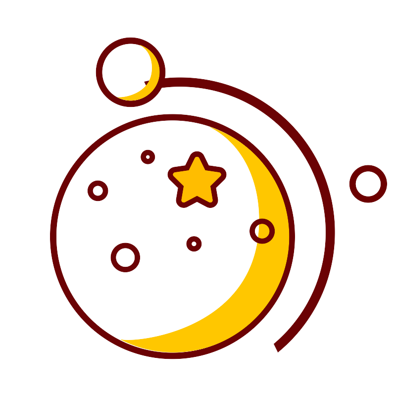 <svg width="800px" height="800px" viewBox="0 0 1024 1024" class="icon" version="1.1" xmlns="http://www.w3.org/2000/svg"><path d="M445.3888 611.09248m-308.47488 0a308.47488 308.47488 0 1 0 616.94976 0 308.47488 308.47488 0 1 0-616.94976 0Z" fill="#FFEC43" /><path d="M445.39392 927.28832c-174.35648 0-316.19584-141.83936-316.19584-316.19584s141.83936-316.19584 316.19584-316.19584 316.19584 141.83936 316.19584 316.19584-141.83936 316.19584-316.19584 316.19584z m0-616.95488c-165.83168 0-300.75392 134.92224-300.75392 300.75392s134.92224 300.75392 300.75392 300.75392 300.75392-134.92224 300.75392-300.75392-134.92224-300.75392-300.75392-300.75392z" fill="#6B0204" /><path d="M323.57376 665.33888m-31.09888 0a31.09888 31.09888 0 1 0 62.19776 0 31.09888 31.09888 0 1 0-62.19776 0Z" fill="#FFEB43" /><path d="M323.57376 702.87872c-20.70016 0-37.53984-16.83968-37.53984-37.53984 0-20.70016 16.83968-37.53984 37.53984-37.53984s37.53984 16.83968 37.53984 37.53984c0 20.70016-16.83968 37.53984-37.53984 37.53984z m0-62.19776a24.69376 24.69376 0 0 0-24.66304 24.65792 24.69376 24.69376 0 0 0 24.66304 24.66304 24.69376 24.69376 0 0 0 24.66304-24.66304 24.69376 24.69376 0 0 0-24.66304-24.65792z" fill="#6B0306" /><path d="M252.38528 492.7232m-19.69152 0a19.69152 19.69152 0 1 0 39.38304 0 19.69152 19.69152 0 1 0-39.38304 0Z" fill="#FFEB43" /><path d="M252.38528 518.8608c-14.4128 0-26.13248-11.71968-26.13248-26.13248s11.71968-26.13248 26.13248-26.13248 26.13248 11.71968 26.13248 26.13248-11.71968 26.13248-26.13248 26.13248z m0-39.38816a13.27616 13.27616 0 0 0-13.25568 13.25568c0 7.30624 5.94944 13.25568 13.25568 13.25568s13.25568-5.94944 13.25568-13.25568a13.27616 13.27616 0 0 0-13.25568-13.25568z" fill="#6B0306" /><path d="M501.00736 630.00576m-12.86144 0a12.86144 12.86144 0 1 0 25.72288 0 12.86144 12.86144 0 1 0-25.72288 0Z" fill="#FFEB43" /><path d="M501.01248 649.30304a19.328 19.328 0 0 1-19.3024-19.3024 19.32288 19.32288 0 0 1 19.3024-19.29216 19.31264 19.31264 0 0 1 19.29216 19.29216c0 10.63936-8.6528 19.3024-19.29216 19.3024z m0-25.71264a6.4256 6.4256 0 1 0 0 12.8512 6.4256 6.4256 0 0 0 0-12.8512z" fill="#6B0306" /><path d="M381.70624 405.3504m-11.63264 0a11.63264 11.63264 0 1 0 23.26528 0 11.63264 11.63264 0 1 0-23.26528 0Z" fill="#FFEB43" /><path d="M381.71136 423.424c-9.9584 0-18.06848-8.11008-18.06848-18.06848s8.11008-18.06848 18.06848-18.06848 18.06848 8.11008 18.06848 18.06848-8.11008 18.06848-18.06848 18.06848z m0-23.26528a5.19168 5.19168 0 1 0 0 10.38336 5.19168 5.19168 0 0 0 0-10.38336z" fill="#6B0306" /><path d="M577.31584 446.592a13.06624 13.06624 0 0 0-10.51648-8.53504l-32.11264-4.70016-13.94688-28.5184c-2.17088-4.44416-6.84544-7.30624-11.90912-7.30624-5.05344 0-9.73312 2.8672-11.90912 7.30624l-13.94688 28.5184-32.10752 4.7104a13.02016 13.02016 0 0 0-10.53184 8.53504 12.49792 12.49792 0 0 0 3.10784 13.11744l23.5776 23.20384-5.46304 32.14336c-0.82432 4.81792 1.32608 9.76896 5.4784 12.61056 3.97824 2.688 9.55392 2.9952 13.85472 0.73216l27.94496-14.8224 27.96032 14.83776a13.55776 13.55776 0 0 0 13.86496-0.74752c4.13184-2.83648 6.27712-7.7824 5.45792-12.5952l-5.46304-32.14336 23.5776-23.20384a12.52864 12.52864 0 0 0 3.08224-13.14304z" fill="#FFBD00" /><path d="M543.104 536.42752a20.06016 20.06016 0 0 1-9.30816-2.31424l-24.96-13.24032-24.92416 13.21472c-6.28736 3.29728-14.68928 2.83136-20.47488-1.08032-6.26176-4.29056-9.46688-11.74528-8.22272-19.04128l4.90496-28.81024-21.19168-20.84864a18.87744 18.87744 0 0 1-4.66432-19.82976 19.44064 19.44064 0 0 1 15.68256-12.78976l28.7488-4.1984 12.43648-25.47712c3.27168-6.64064 10.22464-10.91584 17.70496-10.91584 7.49568 0 14.4384 4.29056 17.69472 10.91584l12.45184 25.47712 28.7488 4.1984a19.5328 19.5328 0 0 1 15.6672 12.75392 18.95424 18.95424 0 0 1-4.65408 19.88096L557.568 485.1712l4.90496 28.82048c1.23392 7.296-1.97632 14.74048-8.16128 18.99008a19.90656 19.90656 0 0 1-11.20768 3.44576z m-34.26816-30.1312l30.98624 16.4352c2.29888 1.18272 5.12 1.02912 7.22944-0.38912 2.03776-1.39776 3.11808-3.83488 2.71872-6.18496l-6.03648-35.46112 25.97888-25.55392c1.74592-1.72032 2.32448-4.13696 1.52064-6.44096a6.63552 6.63552 0 0 0-5.37088-4.26496l-35.46112-5.20704-15.44192-31.5648c-2.18624-4.47488-10.0352-4.49024-12.27264 0.01024l-15.41632 31.54944-35.47648 5.20704a6.6048 6.6048 0 0 0-5.38112 4.29056c-0.7936 2.2784-0.21504 4.66432 1.54624 6.4l25.96864 25.55392-6.01088 35.46112c-0.41472 2.35008 0.68096 4.79232 2.75456 6.22592 1.90976 1.26976 5.0688 1.4592 7.22944 0.33792l30.93504-16.40448z" fill="#6B0204" /><path d="M543.0272 328.09472c96.59392 49.50016 137.47712 165.22752 124.61056 280.50432-28.07296 251.58656-325.77024 278.72768-355.61984 268.71808a297.38496 297.38496 0 0 0 136.01792 32.78848c165.00224 0 298.76224-133.76 298.76224-298.76224 0-131.77856-85.36064-243.54816-203.77088-283.24864z" fill="#FFC700" /><path d="M677.30432 597.16608m-25.72288 0a25.72288 25.72288 0 1 0 51.44576 0 25.72288 25.72288 0 1 0-51.44576 0Z" fill="#FFEB43" /><path d="M677.2992 629.33504c-17.73056 0-32.1536-14.4384-32.1536-32.16896s14.42304-32.16896 32.1536-32.16896 32.16896 14.4384 32.16896 32.16896-14.4384 32.16896-32.16896 32.16896z m0-51.456a19.30752 19.30752 0 0 0-19.2768 19.29216 19.30752 19.30752 0 0 0 19.2768 19.29216 19.31264 19.31264 0 0 0 19.29216-19.29216 19.31776 19.31776 0 0 0-19.29216-19.29216z" fill="#6B0306" /><path d="M383.17056 232.1408c26.31168-5.8112 53.56544-9.10336 81.62816-9.10336 208.33792 0 377.23136 168.89344 377.23136 377.23136 0 115.79392-52.28032 219.27936-134.4 288.47616l10.496 21.248c89.61024-73.38496 146.82112-184.86272 146.82112-309.72416 0-220.99968-179.15392-400.1536-400.1536-400.1536a401.0496 401.0496 0 0 0-92.12416 10.7776l10.50112 21.248z" fill="#6B0204" /><path d="M337.26464 186.14272m-81.7152 0a81.7152 81.7152 0 1 0 163.4304 0 81.7152 81.7152 0 1 0-163.4304 0Z" fill="#FFEC43" /><path d="M337.26976 275.57376c-49.32096 0-89.43616-40.1152-89.43616-89.43616 0-49.31072 40.1152-89.42592 89.43616-89.42592s89.43616 40.1152 89.43616 89.42592c0 49.32096-40.1152 89.436