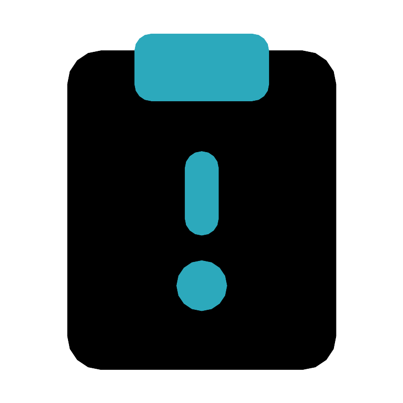 <svg fill="#000000" width="800px" height="800px" viewBox="0 0 24 24" id="note-alert" data-name="Flat Color" xmlns="http://www.w3.org/2000/svg" class="icon flat-color"><rect id="primary" x="4" y="3" width="16" height="19" rx="2" style="fill: rgb(0, 0, 0);"></rect><path id="secondary" d="M16,3V5a1,1,0,0,1-1,1H9A1,1,0,0,1,8,5V3A1,1,0,0,1,9,2h6A1,1,0,0,1,16,3ZM13,13V10a1,1,0,0,0-2,0v3a1,1,0,0,0,2,0Zm-1,2.5A1.5,1.5,0,1,0,13.5,17,1.5,1.5,0,0,0,12,15.5Z" style="fill: rgb(44, 169, 188);"></path></svg>
