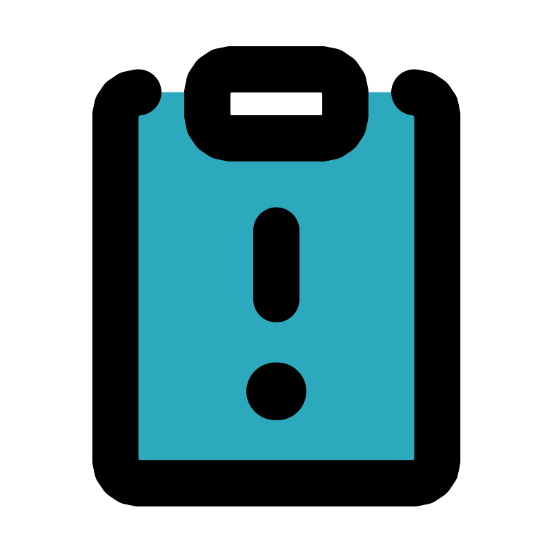 <svg fill="#000000" width="800px" height="800px" viewBox="0 0 24 24" id="note-alert" data-name="Flat Line" xmlns="http://www.w3.org/2000/svg" class="icon flat-line"><path id="secondary" d="M18,4H15V5a1,1,0,0,1-1,1H10A1,1,0,0,1,9,5V4H6A1,1,0,0,0,5,5V20a1,1,0,0,0,1,1H18a1,1,0,0,0,1-1V5A1,1,0,0,0,18,4Z" style="fill: rgb(44, 169, 188); stroke-width: 2;"></path><path id="primary" d="M14,6H10A1,1,0,0,1,9,5V4a1,1,0,0,1,1-1h4a1,1,0,0,1,1,1V5A1,1,0,0,1,14,6Zm-2,4v3" style="fill: none; stroke: rgb(0, 0, 0); stroke-linecap: round; stroke-linejoin: round; stroke-width: 2;"></path><line id="primary-upstroke" x1="11.95" y1="17" x2="12.05" y2="17" style="fill: none; stroke: rgb(0, 0, 0); stroke-linecap: round; stroke-linejoin: round; stroke-width: 2.5;"></line><path id="primary-2" data-name="primary" d="M18,4a1,1,0,0,1,1,1V20a1,1,0,0,1-1,1H6a1,1,0,0,1-1-1V5A1,1,0,0,1,6,4" style="fill: none; stroke: rgb(0, 0, 0); stroke-linecap: round; stroke-linejoin: round; stroke-width: 2;"></path></svg>