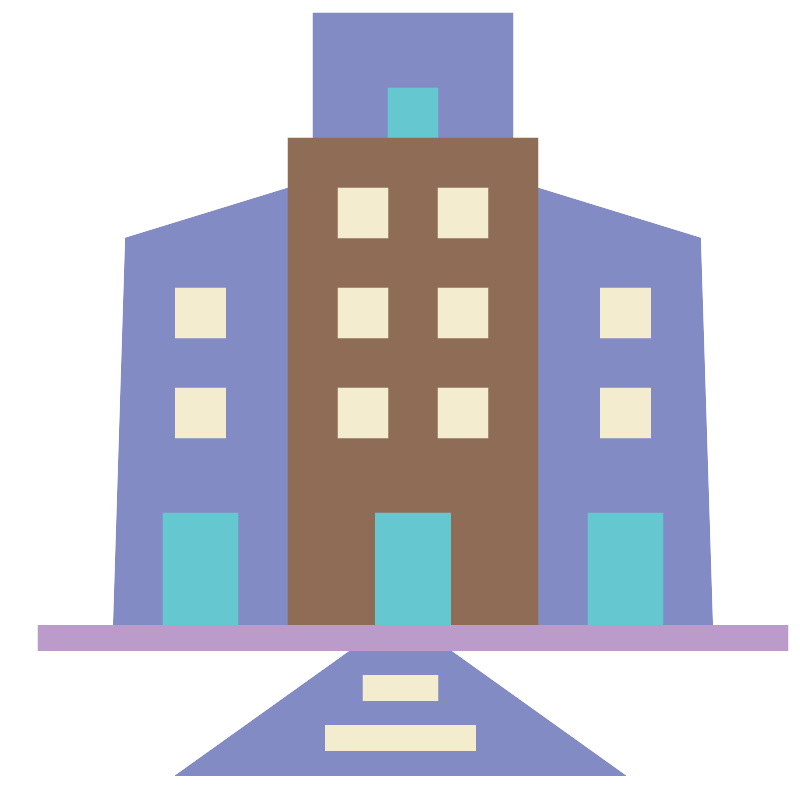 <svg width="800px" height="800px" viewBox="0 0 64 64" data-name="Layer 1" id="Layer_1" xmlns="http://www.w3.org/2000/svg"><defs><style>.cls-1{fill:#838bc5;}.cls-2{fill:#65c8d0;}.cls-3{fill:#8f6c56;}.cls-4{fill:#ba9bc9;}.cls-5{fill:#f4ecce;}</style></defs><polyline class="cls-1" points="36 52 50 62 14 62 28 52"/><polygon class="cls-1" points="57 51 43 51 43 15 56 19 57 51"/><polygon class="cls-1" points="9 51 23 51 23 15 10 19 9 51"/><polyline class="cls-1" points="25 11 25 1 41 1 41 11"/><polyline class="cls-2" points="31 11 31 7 35 7 35 11"/><polyline class="cls-3" points="23 51 23 11 43 11 43 51"/><polyline class="cls-2" points="30 51 30 41 36 41 36 51"/><polyline class="cls-2" points="47 51 47 41 53 41 53 51"/><polyline class="cls-2" points="13 51 13 41 19 41 19 51"/><rect class="cls-4" height="2" width="60" x="3" y="50"/><rect class="cls-5" height="4" width="4" x="27" y="15"/><rect class="cls-5" height="4" width="4" x="35" y="15"/><rect class="cls-5" height="4" width="4" x="27" y="23"/><rect class="cls-5" height="4" width="4" x="35" y="23"/><rect class="cls-5" height="4" width="4" x="27" y="31"/><rect class="cls-5" height="4" width="4" x="14" y="23"/><rect class="cls-5" height="4" width="4" x="14" y="31"/><rect class="cls-5" height="4" width="4" x="48" y="23"/><rect class="cls-5" height="4" width="4" x="48" y="31"/><rect class="cls-5" height="4" width="4" x="35" y="31"/><rect class="cls-5" height="2" width="6" x="29" y="54"/><rect class="cls-5" height="2" width="12" x="26" y="58"/></svg>
