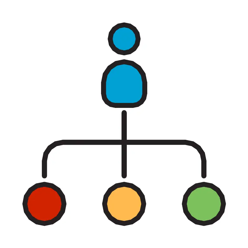<svg width="800px" height="800px" viewBox="0 0 50 50" data-name="Layer 1" id="Layer_1" xmlns="http://www.w3.org/2000/svg"><defs><style>.cls-1{fill:#231f20;}.cls-2{fill:#00a1d3;}.cls-3{fill:#ffba50;}.cls-4{fill:#7cc05b;}.cls-5{fill:#d12200;}</style></defs><title/><path class="cls-1" d="M25,11.107a3.3,3.3,0,1,0-3.3-3.3A3.307,3.307,0,0,0,25,11.107Z"/><path class="cls-2" d="M25,5.5a2.3,2.3,0,1,1-2.3,2.3A2.306,2.306,0,0,1,25,5.5Z"/><path class="cls-1" d="M23.223,21.7h3.554a2.856,2.856,0,0,0,2.853-2.853V16.573a4.63,4.63,0,1,0-9.26,0v2.278A2.856,2.856,0,0,0,23.223,21.7Z"/><path class="cls-2" d="M21.37,16.573a3.63,3.63,0,1,1,7.26,0v2.278A1.855,1.855,0,0,1,26.777,20.7H23.223a1.855,1.855,0,0,1-1.853-1.853Z"/><circle class="cls-1" cx="25" cy="41.073" r="4.427"/><circle class="cls-3" cx="25" cy="41.073" r="3.427"/><circle class="cls-1" cx="41.073" cy="41.073" r="4.427"/><circle class="cls-4" cx="41.073" cy="41.073" r="3.427"/><circle class="cls-1" cx="8.927" cy="41.073" r="4.427"/><circle class="cls-5" cx="8.927" cy="41.073" r="3.427"/><path class="cls-1" d="M8.927,35.92a.5.5,0,0,0,.5-.5V32.4a3.244,3.244,0,0,1,3.24-3.24H24.5V35.42a.5.5,0,0,0,1,0V29.156H37.333a3.244,3.244,0,0,1,3.24,3.24V35.42a.5.5,0,0,0,1,0V32.4a4.245,4.245,0,0,0-4.24-4.24H25.5V22.694a.5.5,0,0,0-1,0v5.462H12.667a4.245,4.245,0,0,0-4.24,4.24V35.42A.5.5,0,0,0,8.927,35.92Z"/></svg>