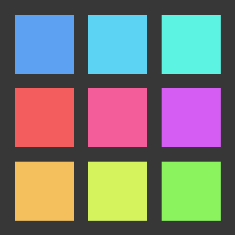 <svg width="800px" height="800px" viewBox="0 0 16 16" xmlns:dc="http://purl.org/dc/elements/1.1/" xmlns:cc="http://creativecommons.org/ns#" xmlns:rdf="http://www.w3.org/1999/02/22-rdf-syntax-ns#" xmlns="http://www.w3.org/2000/svg" version="1.1" id="svg6190"><metadata id="metadata6196"><rdf:RDF><cc:Work><dc:format>image/svg+xml</dc:format><dc:type rdf:resource="http://purl.org/dc/dcmitype/StillImage"/><dc:title/><dc:date>2021</dc:date><dc:creator><cc:Agent><dc:title>Timothée Giet</dc:title></cc:Agent></dc:creator><cc:license rdf:resource="http://creativecommons.org/licenses/by-sa/4.0/"/></cc:Work><cc:License rdf:about="http://creativecommons.org/licenses/by-sa/4.0/"><cc:permits rdf:resource="http://creativecommons.org/ns#Reproduction"/><cc:permits rdf:resource="http://creativecommons.org/ns#Distribution"/><cc:requires rdf:resource="http://creativecommons.org/ns#Notice"/><cc:requires rdf:resource="http://creativecommons.org/ns#Attribution"/><cc:permits rdf:resource="http://creativecommons.org/ns#DerivativeWorks"/><cc:requires rdf:resource="http://creativecommons.org/ns#ShareAlike"/></cc:License></rdf:RDF></metadata><rect style="opacity:1;vector-effect:none;fill:#373737;fill-opacity:1;stroke:none;stroke-width:3.20000005;stroke-linecap:square;stroke-linejoin:round;stroke-miterlimit:4;stroke-dasharray:none;stroke-dashoffset:3.20000005;stroke-opacity:1" id="rect1290" width="16" height="16" x="0" y="0"/><rect y="1" x="1" height="4.0000005" width="4.0000005" id="rect6829-4" style="display:inline;fill:#5da1f3;fill-opacity:1;stroke:none;stroke-width:1.15467715"/><rect style="display:inline;fill:#5dd3f3;fill-opacity:1;stroke:none;stroke-width:1.15467715" id="rect6831-7" width="4.0000005" height="4.0000005" x="6" y="1"/><rect y="1" x="11" height="4.0000005" width="4.0000005" id="rect6833-1" style="display:inline;fill:#5df3e3;fill-opacity:1;stroke:none;stroke-width:1.15467715"/><rect style="display:inline;fill:#f35d5d;fill-opacity:1;stroke:none;stroke-width:1.15466905" id="rect6835-3" width="4.0000005" height="3.999944" x="1" y="6"/><rect y="11" x="1" height="4.0000005" width="4.0000005" id="rect6837-2" style="display:inline;fill:#f3c05d;fill-opacity:1;stroke:none;stroke-width:1.15467715"/><rect y="6" x="6" height="3.999944" width="4.0000005" id="rect6839-1" style="display:inline;fill:#f35d99;fill-opacity:1;stroke:none;stroke-width:1.15466905"/><rect style="display:inline;fill:#d55df3;fill-opacity:1;stroke:none;stroke-width:1.15466905" id="rect6841-6" width="4.0000005" height="3.999944" x="11" y="6"/><rect style="display:inline;fill:#d5f35d;fill-opacity:1;stroke:none;stroke-width:1.15467715" id="rect6843-3" width="4.0000005" height="4.0000005" x="6" y="11"/><rect y="11" x="11" height="4.0000005" width="4.0000005" id="rect6845-8" style="display:inline;fill:#8bf35d;fill-opacity:1;stroke:none;stroke-width:1.15467715"/></svg>