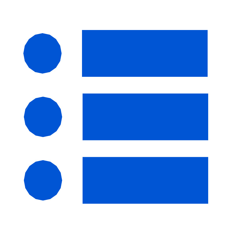 <svg width="800px" height="800px" viewBox="0 0 32 32" xmlns="http://www.w3.org/2000/svg"><title>file_type_pddl_happenings</title><rect x="11.36" y="4.15" width="17.37" height="6.45" style="fill:#0055d4"/><ellipse cx="5.863" cy="7.375" rx="2.638" ry="2.785" style="fill:#0055d4"/><rect x="11.433" y="12.945" width="17.37" height="6.45" style="fill:#0055d4"/><ellipse cx="5.936" cy="16.169" rx="2.638" ry="2.785" style="fill:#0055d4"/><rect x="11.433" y="21.739" width="17.37" height="6.45" style="fill:#0055d4"/><ellipse cx="5.936" cy="24.964" rx="2.638" ry="2.785" style="fill:#0055d4"/></svg>