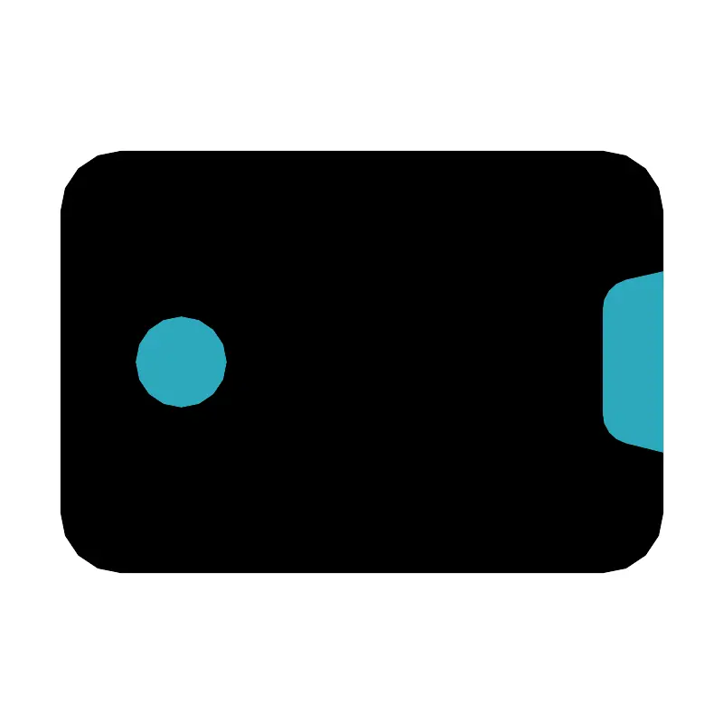 <svg fill="#000000" width="800px" height="800px" viewBox="0 0 24 24" id="phone-device-rotare-right" data-name="Flat Color" xmlns="http://www.w3.org/2000/svg" class="icon flat-color"><rect id="primary" x="2" y="5" width="20" height="14" rx="2" style="fill: rgb(0, 0, 0);"></rect><path id="secondary" d="M22,15l-1.24-.31a1,1,0,0,1-.76-1V10.28a1,1,0,0,1,.76-1L22,9ZM7.5,12A1.5,1.5,0,1,0,6,13.5,1.5,1.5,0,0,0,7.5,12Z" style="fill: rgb(44, 169, 188);"></path></svg>