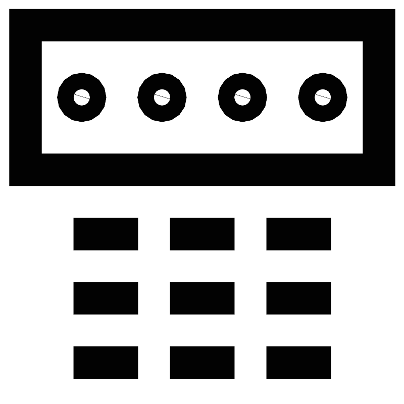 <svg width="800px" height="800px" viewBox="0 0 24 24" id="Layer_1" data-name="Layer 1" xmlns="http://www.w3.org/2000/svg"><defs><style>.cls-1{fill:none;stroke:#020202;stroke-miterlimit:10;stroke-width:1.91px;}</style></defs><rect class="cls-1" x="1.5" y="1.48" width="21" height="8.59"/><circle class="cls-1" cx="4.84" cy="5.77" r="0.48"/><circle class="cls-1" cx="9.61" cy="5.77" r="0.48"/><circle class="cls-1" cx="14.39" cy="5.77" r="0.48"/><circle class="cls-1" cx="19.16" cy="5.77" r="0.48"/><line class="cls-1" x1="10.09" y1="13.89" x2="13.91" y2="13.89"/><line class="cls-1" x1="15.82" y1="13.89" x2="19.64" y2="13.89"/><line class="cls-1" x1="4.36" y1="13.89" x2="8.18" y2="13.89"/><line class="cls-1" x1="10.09" y1="17.7" x2="13.91" y2="17.7"/><line class="cls-1" x1="15.82" y1="17.7" x2="19.64" y2="17.7"/><line class="cls-1" x1="4.36" y1="17.7" x2="8.18" y2="17.7"/><line class="cls-1" x1="10.09" y1="21.52" x2="13.91" y2="21.52"/><line class="cls-1" x1="15.82" y1="21.52" x2="19.64" y2="21.52"/><line class="cls-1" x1="4.36" y1="21.52" x2="8.18" y2="21.52"/></svg>
