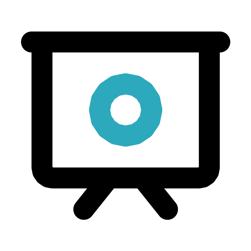 <svg fill="#000000" width="800px" height="800px" viewBox="0 0 24 24" id="present-circle" data-name="Line Color" xmlns="http://www.w3.org/2000/svg" class="icon line-color"><circle id="secondary" cx="12" cy="10.5" r="2.5" style="fill: none; stroke: rgb(44, 169, 188); stroke-linecap: round; stroke-linejoin: round; stroke-width: 2;"></circle><path id="primary" d="M19,17H5a1,1,0,0,1-1-1V4H20V16A1,1,0,0,1,19,17ZM3,4H21M10.4,17,8,20m5.6-3L16,20" style="fill: none; stroke: rgb(0, 0, 0); stroke-linecap: round; stroke-linejoin: round; stroke-width: 2;"></path></svg>