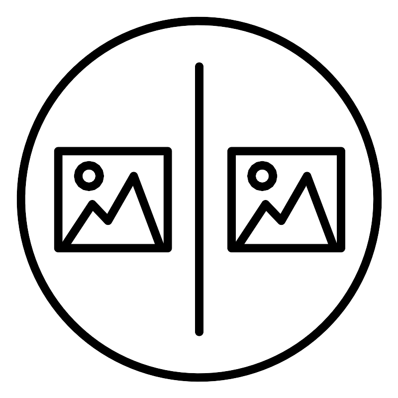 <svg width="800px" height="800px" viewBox="0 0 48 48" id="b" xmlns="http://www.w3.org/2000/svg"><defs><style>.c{fill:none;stroke:#000000;stroke-linecap:round;stroke-linejoin:round;}</style></defs><circle class="c" cx="24" cy="24" r="21.5"/><line class="c" x1="24" y1="8" x2="24" y2="40"/><rect class="c" x="7" y="18.2" width="13.2" height="11.7"/><circle class="c" cx="10.7" cy="21.2" r="1.3"/><polyline class="c" points="7.8 29.6 11.1 24.6 13 26.6 16.1 21.2 19.3 29.7"/><rect class="c" x="27.9" y="18.2" width="13.2" height="11.7"/><circle class="c" cx="31.6" cy="21.2" r="1.3"/><polyline class="c" points="28.7 29.6 32 24.6 33.9 26.6 37 21.2 40.2 29.7"/></svg>
